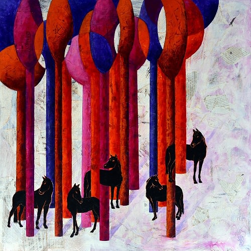 Le tele esposte per Evocativo sono un’illusione ottica, dove le figure dei cavalli si intrecciano con gli alberi attorno. Ciò crea un fenomeno interessante; non è sempre chiaro se un cavallo si trova di fronte o dietro a un altro. Questo posizionamento fisico impossibile riflette sulla rete della vita, su quelle situazioni che sembrano impossibile in cui non riusciamo a trovare una via d’uscita.