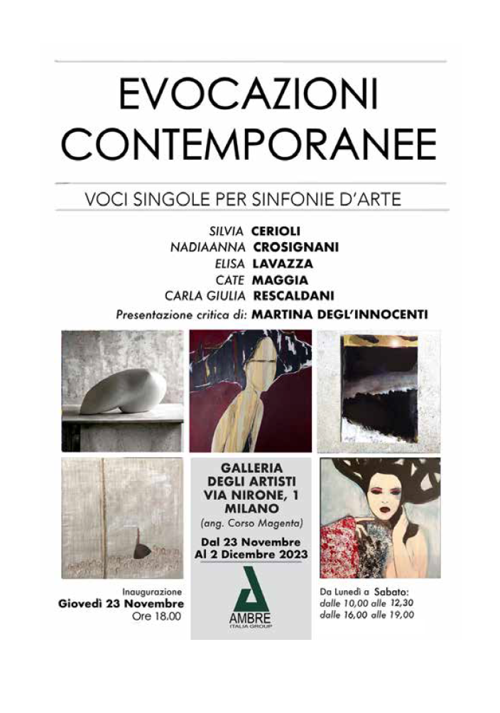MILANO, XX Ottobre 2023 - Un’esposizione cha dà voce ad artiste perché raccontino la propria visione del mondo di oggi. Oraganizzata da Giusi Sezana in collaborazione con l’associazione culturale Ambre Groupe Italia la mostra Evocazioni contemporanee avrà luogo presso la Galleria degli Artisti a Milano in via Nirone 1 a partire dal 23 novembre con un’inaugurazione alle ore 18.00, fno al 2 dicembre.
