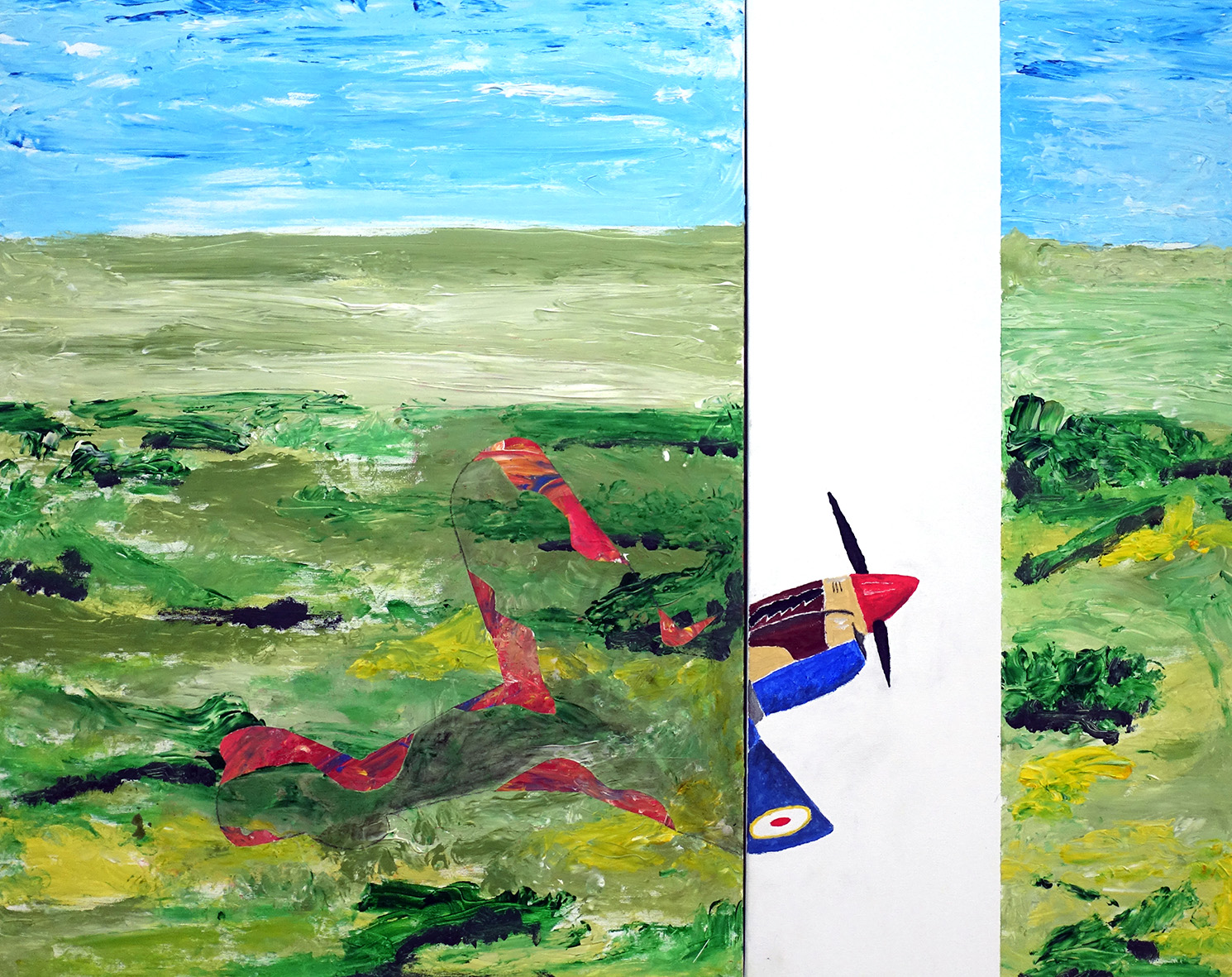 Le opere di Alessandro Monti, artista modenese classe 1950, attingono alle ricerche oggettuali degli anni '60, rilette alla luce della contemporaneità e inondate da sferzante ironia. Se nei fondi liberi e mossi si percepisce il piacere della pittura, la suddivisione del dipinto in fasce verticali rivela il carattere ambiguo del soggetto ritratto, mentre il titolo e l'oggetto (che fa da pendant al quadro) diventano strumenti imprescindibili per l'esegesi dell'opera stessa. Per la mostra Evolutions, l'artista presenta due lavori che alludono a macchine del recente passato: un aereo da guerra della prima metà del '900 (Rosso Barone, 2020) e un'utilitaria anni '60 (Amore a prima vista, 2020), testimonianze di una tecnologia superata che diventa icona pop. Una riflessione sulla percezione del tempo nella società contemporanea e sulla velocità con cui ciò che oggi è innovativo diventa presto obsoleto.