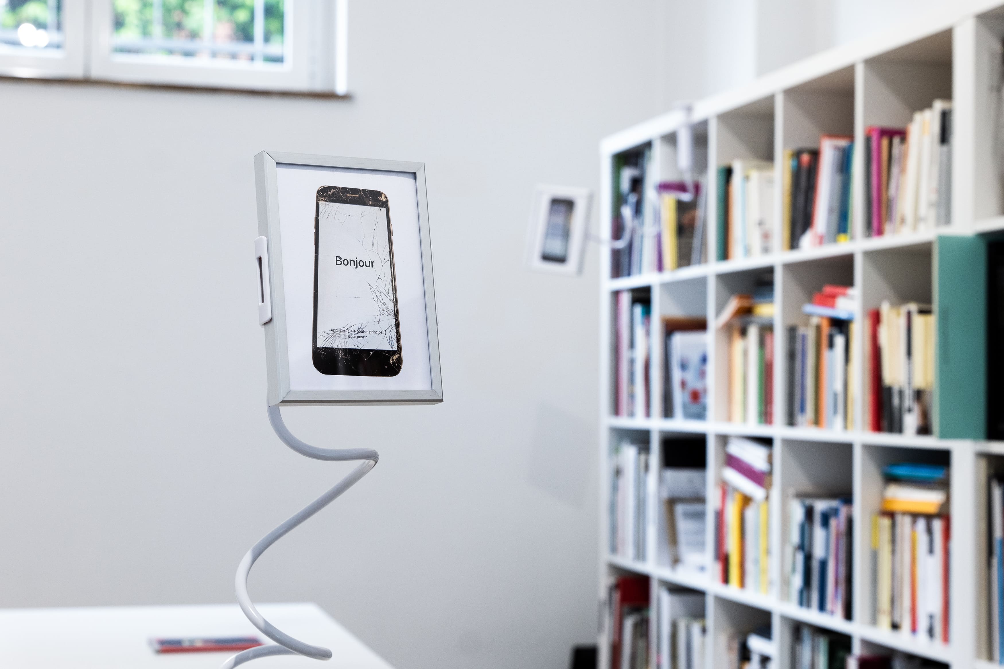 È massivo e intralciante l’intervento pensato da Mattia Ciaf in coerenza con il concept del suo progetto per Chippendale Studio. The last goodbye invade viralmente lo spazio espositivo attraverso una serie di fotografie trovate dall’autore scrollando la pagina di Ebay. Le immagini propongono alcuni cellulari iPhone che, nonostante presentino uno schermo completamente distrutto, vengono comunque venduti. Sulla superficie campeggia l’iconica scritta “ciao” (proposta in diverse lingue) normalmente visibile alla prima accensione del telefono e che in maniera ironica sembra salutare – non sappiamo se per la prima o per l’ultima volta, vista la vendita – il suo interlocutore. Le immagini, inserite all’interno di cornici in alluminio e installate mediante bracci allungabili, costituiscono per Ciaf il punto di partenza per avviare una riflessione che intende esplorare le tematiche della fragilità e dell’effimero della tecnologia moderna. Nello specifico The Last Goodbye si concentra sulla relazione tra gli esseri umani e i loro dispositivi digitali: la scritta di saluti, ironica e drammatica allo stesso tempo, che compare sullo schermo rotto, rappresenta l'idea che questi oggetti possano avere una loro personalità e relazionarsi con l’osservatore, creando un contrasto tra la loro evidente distruzione e il messaggio rincuorante di benvenuto. Attraverso questa opera, l’artista invita lo spettatore a riflettere sul proprio rapporto con la tecnologia e su come essa stia cambiando il modo in cui l’essere umano si relaziona e comunica con gli altri.