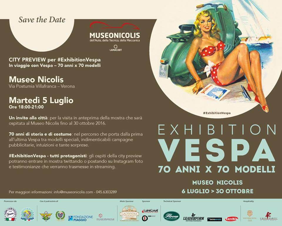 «Per questo #ExhibitionVespa è un hashtag: sui Social Network si possono postare foto e ricordi che verranno trasmessi in streaming nei percorso di mostra. il racconto più coinvolgente riceverà un premio speciale: potrà esporre la propria Vespa a fianco dei modelli unici di 7 decadi fa. Entrambi – la Vespa di tutti i giorni e il pezzo introvabile – fanno parte della memoria e, per un museo contemporaneo, meritano di essere raccontate una fianco all’altra”.