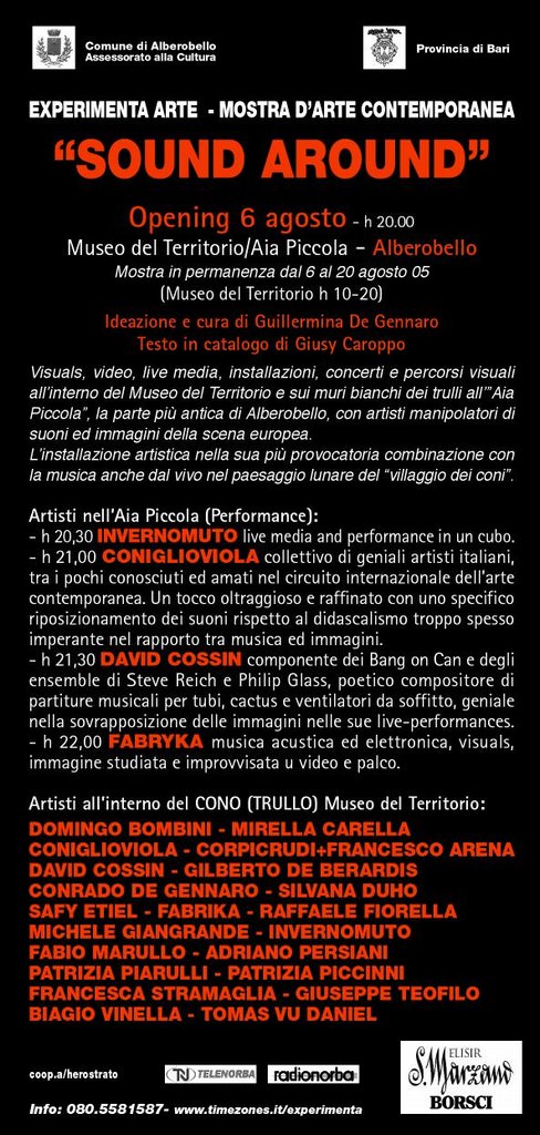 visuals, video, live media, installazioni, concerti e percorsi visuali all’interno del museo del territorio e sui muri bianchi dei trulli all’aia piccola, la parte piu’ antica di alberobello, con artisti manipolatori di suoni ed immagini della scena europea. l’installazione artistica nella sua piu’ provocatoria combinazione con la musica anche dal vivo nel paesaggio lunare del “villaggio dei coni”.