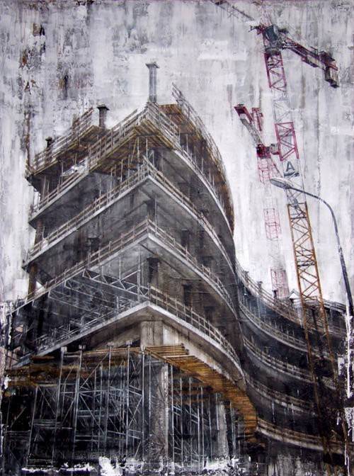 Walter Trecchi torna a esporre a Corrente con una serie di Cantieri che registra l'avanzamento dei lavori in alcuni grandi luoghi di trasformazione milanesi. La Nuova Sede della Regione, intanto battezzata Palazzo Lombardia, si innalza oltre il livello delle fondamenta che il pittore aveva registrato nella sua prima partecipazione a 'Expossible?' e mostra il profilo sinuoso, sostenuto dallo slancio vertiginoso di gru altissime. La complessità dell'architettura in fieri si mostra nella sovrapposizione incompleta di piani, nell'intersecarsi di legno, cemento e ferro, nell'aggetto delle passerelle per gli operai, che trasformano l'edificio in costruzione in un prisma dalle molteplici facce. Il vuoto si ritira entro i vani delle finestre, i teli dispiegati proiettano all'esterno le ombre di una struttura in progressivo riempimento, che utilizza gli stessi materiali con i quali Trecchi prepara le proprie tele. E' la materia che si riappropria dello spazio occupato dalle immagini computerizzate diffuse a illustrazione dei progetti, che prefigurano le nuove architetture nella trama della città. Questa si stende su cieli bianchi e corrosi, in attesa di una vera rinascita.