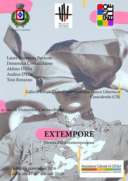 Il prossimo 5 novembre una selezione di artisti della galleria SpazioELLE – centro di ricerca e sperimentazione artistica di Castel Gandolfo (Roma)* sarà ospite della Galleria Civica d’Arte Contemporanea Franco Libertucci** di Casacalenda (CB). In esposizione, dalle ore 17:30 alle 20:00, opere realizzate da Laura Giovanna Bevione, Domenico Cornacchione, Aldisio D’Elia, Andrea D’Elia e Toni Rotunno. Questa mostra, intitolata Extempore, rientra nel progetto artistico “Ciascuno a suo modo”, ideato dallo SpazioELLE e patrocinato dal Comune di Casacalenda (CB).