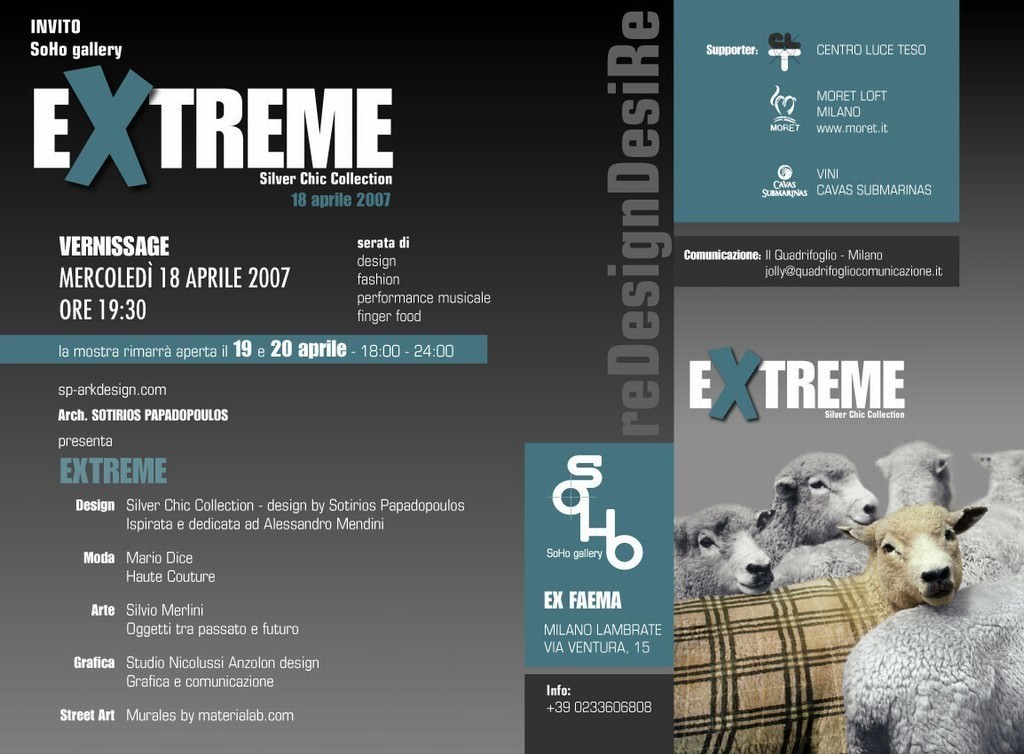 La SohoGallery (ex Faema in Via Ventura) diventa l’unico palcoscenico per cinque artisti estrosi e poliedrici. Lavorando a cavallo tra arte, cultura, moda e design questi giovani diventano protagonisti indiscussi del proprio slancio creativo andando incontro alle tendenze del design contemporaneo. La rassegna è intitolata ad Alessandro Mendini.