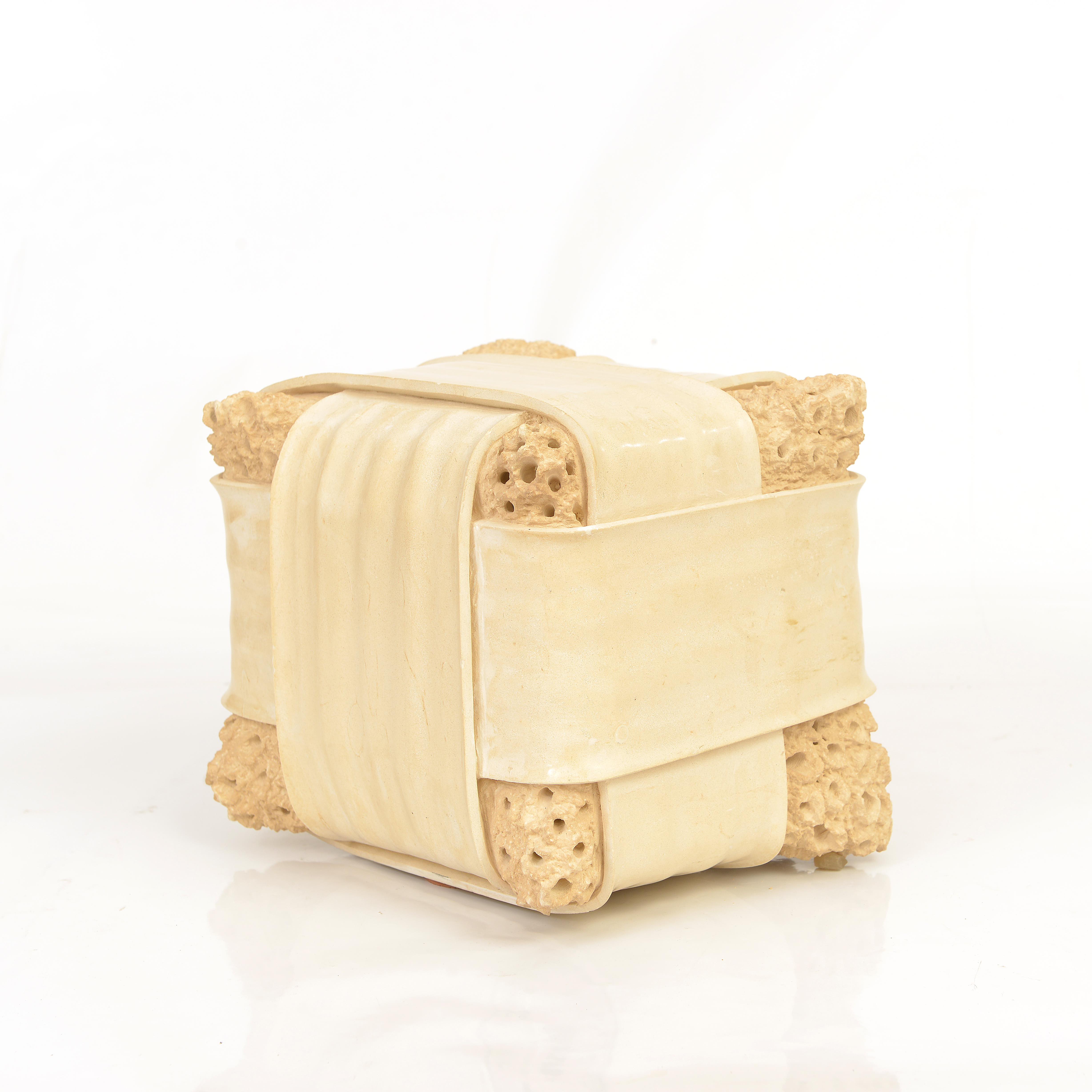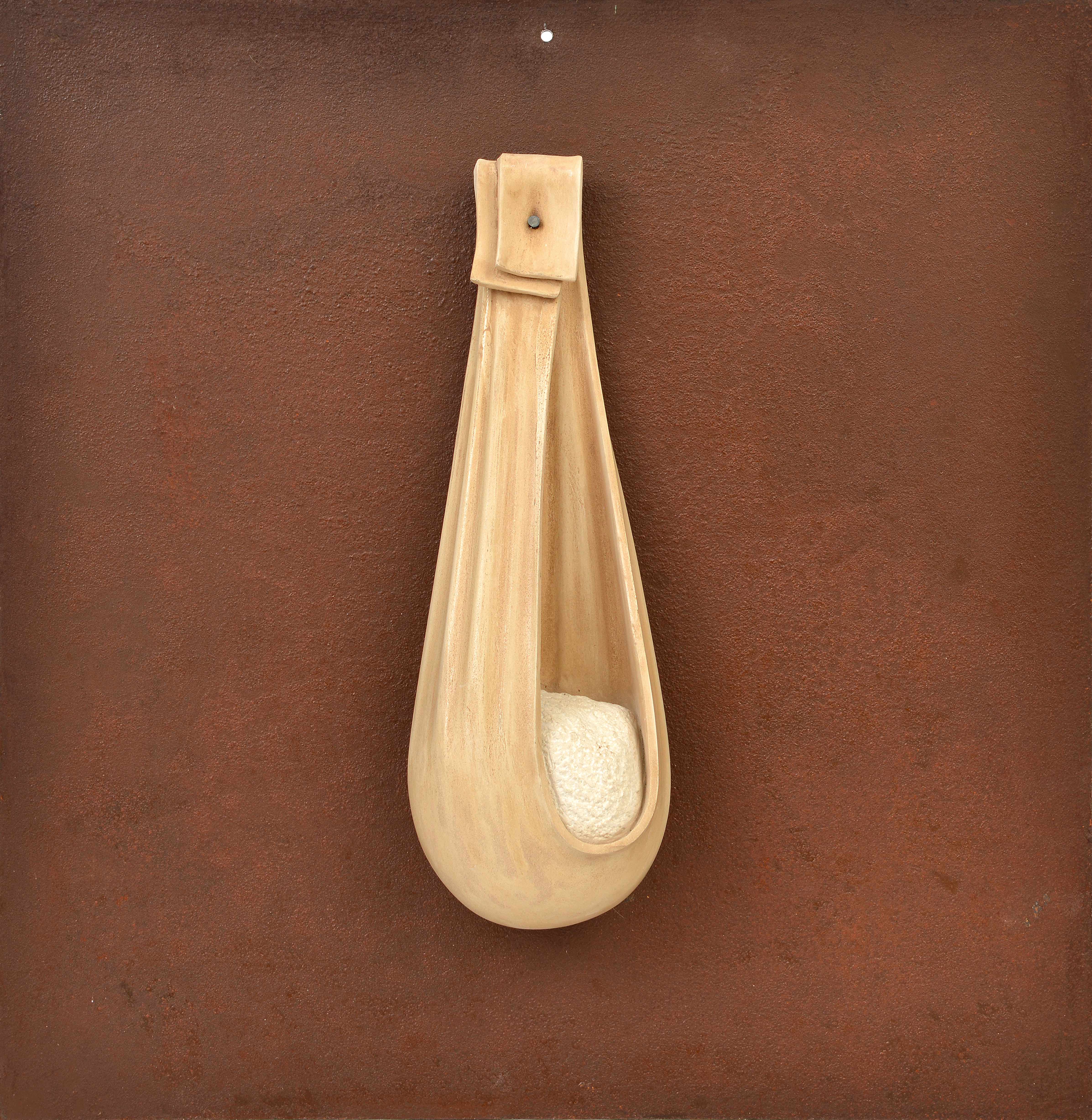 Da armatura tesa a stringere nelle prime realizzazioni di Cicciarella, dove la fascia era inizialmente la volontà pulsante e dirompente di esplodere, di liberarsi e divincolarsi da una vita che lo distoglieva dalle sue più sentite e personali missioni di ricerca, ora lo scultore, finalmente liberato, rotte le cinghie soffocanti, raccoglie i cocci per ricomporsi e per riappropriarsi di sé, assaporando finalmente la vera bellezza dell’atto creativo manuale, senza ordini predefiniti o metodi imposti. Arriva quindi ad avvertire il bisogno umano sincero di un bendaggio avvolgente che comunica conforto, come un istinto necessario ad abbracciarsi.