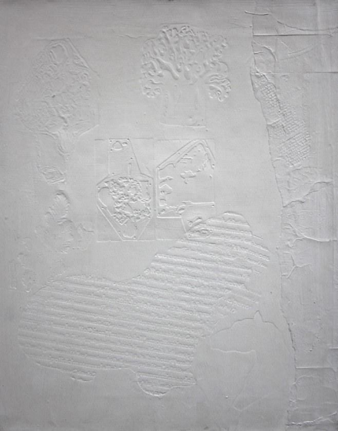 Davide Binello scolpisce visioni di luce in cui la totale assenza cromatica abbaglia come uno spettro. Le scanalature appaiono come una pietra indispensabile per sostenere lo stile: ruvide, da levigare, inesorabili nella loro forza necessaria, tautologica, autogenerativa. Le forme si aprono brecce, producendo e rilasciando residui materici in superficie. Alla soglia del quadro, un demiurgo inconsapevole registra i tentativi e gli sforzi, suscettibili al tocco, di passare al di là.