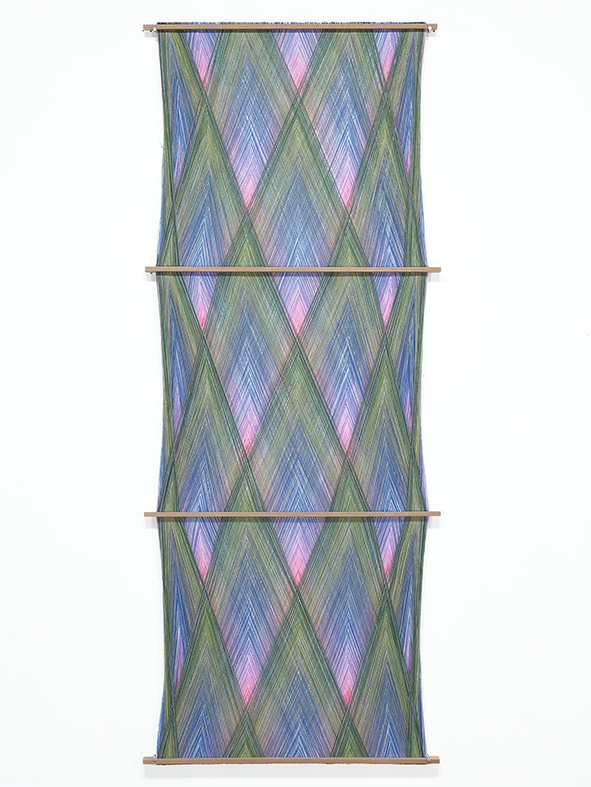 Will Cruickshank lavora con un’attitudine multidisciplinare che include scultura, tessitura, film, fotografia e stampa. Le opere in mostra sono oggetti nati da macchinari sperimentali messi a punto dall’artista stesso, che sceglie di conseguenza materiali (filati, legno, gesso e pigmenti) e metodi di produzione (filatura, tessitura, colorazione, scultura). Nel suo lavoro l’aspetto sperimentale e macchinistico, unisce l’improvvisazione al progetto, in un unico processo in cui la creatività è impiegata per mettere a punto tanto gli strumenti quanto gli oggetti che da essi originano. Riutilizzando spesso attrezzature come betoniere, biciclette o ruote da vasaio, ha ideato complesse macchine per tessere improvvisate, torni improvvisati, macchine da stampa e tecniche di intaglio ad acqua.