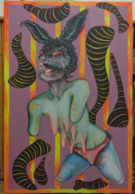 Barre dai colori sgargianti e melma colante caratterizzano le opere in esposizione create dall’artista Fabiana Teodonno. Figure antropomorfe e zoomorfe si alternano e talvolta uniscono in composizioni visionarie ricche di follia, esuberanza, disagio e malessere.
