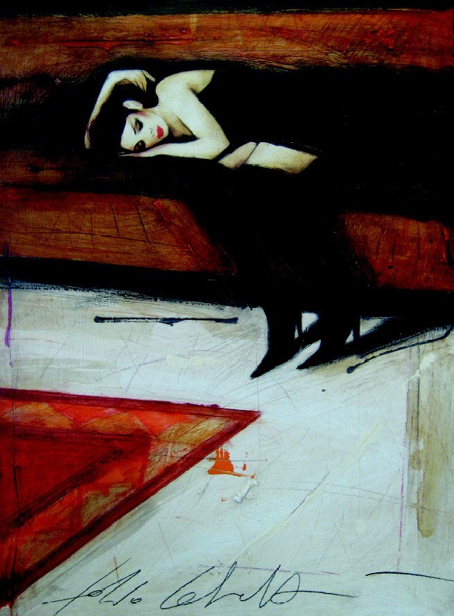 “…donne tristi per la vendemmia dell’uomo…”. Così Alda Merini descrive la “donna” che è spesso ritratta da Fabio Calvetti: pelle bianca liscia, labbra rosse, occhi bassi che sembrano guardare nel vuoto in attesa. Sensazione di vuoto, di silenzio, di una vita che scorre attorno senza toccarci.