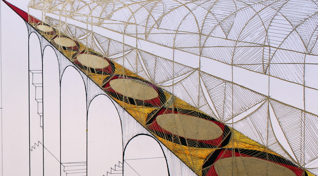 Una serie di proiezioni architetturali che da un caos geometrico generano un Mondo e la ricerca della Verità attraverso Porte (rossa, verde e blu) e specchiate Porte magiche o Portali di un Mondo in cui accedere attraverso Ponti coordinati alle mattonelle primarie; discese e risalite su analoghe Torri in cui è possibile osservare una verità, ampliando necessariamente l'orizzonte e lo spazio. Pattern progettuale dell'immaginario architettonico di un labirinto in cui l'autore adotta le techiche di proiezioni ortogonali della geometria descrittiva, ma con una ampia caratura percettivo emozionale e fantastiche decorazioni su matita di pennarelli, ecoline e colori acrilici che sconfinano daglli strombi delle vedute, nella serialità dell'illustrazione e del design grafico.
