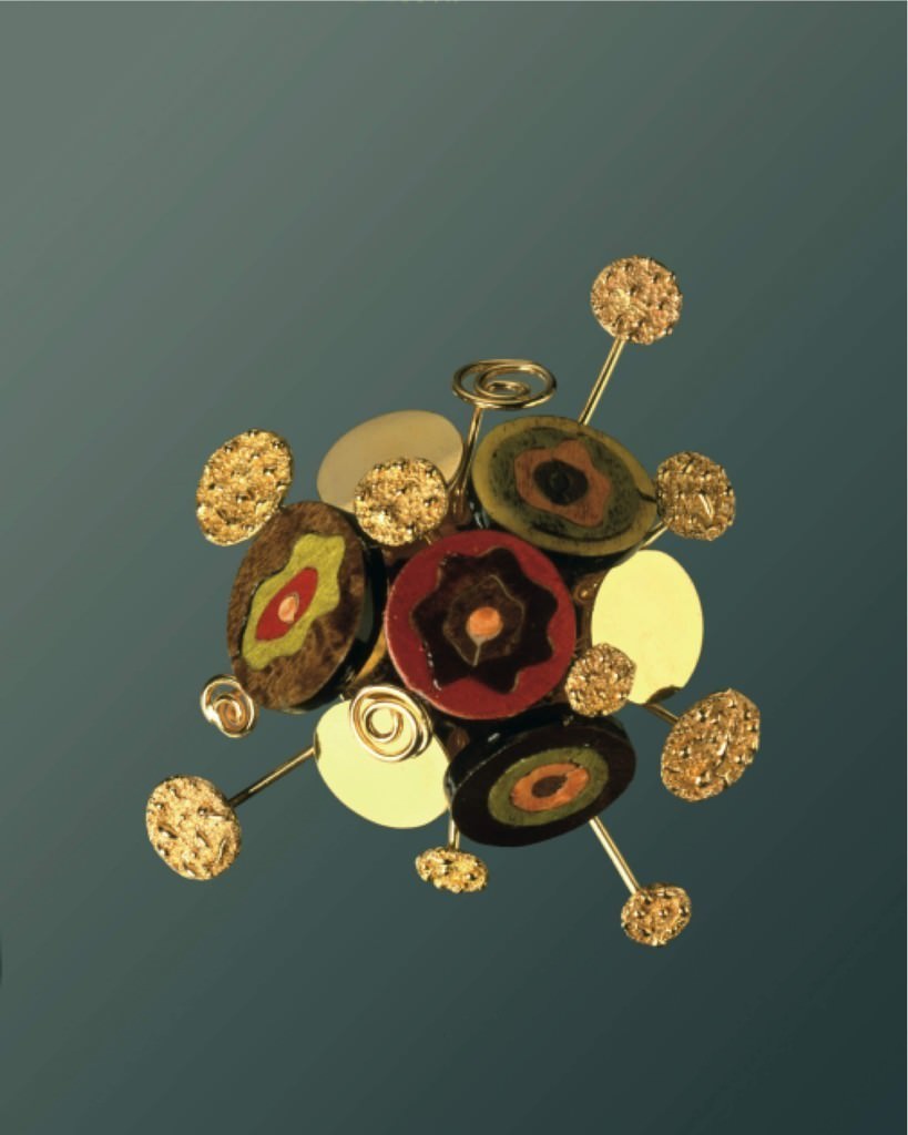 Le ultime opere hanno forme sorprendenti: le spille diagonali dalle pietre incassate e riquadrate, ai fiori veri incastrati tra lamine. Un accostamento inusuale che genera un monile dalla strana curva che asseconda il corpo. O che il corpo deve imparare ad assecondare, in una felice costrizione dei sensi. (Giusi Ferrè)