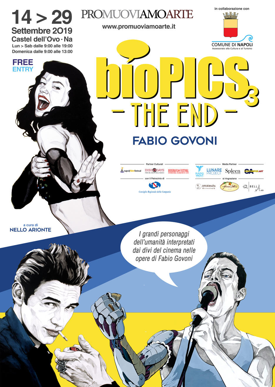 “Biopics3 – The End” è una mostra in cui i grandi personaggi dell’umanità rivivono nelle tele dell’artista ed illustratore modenese Fabio Govoni, prendendo in prestito i volti dei divi del cinema. Una mostra-evento a cura di Nello Arionte.