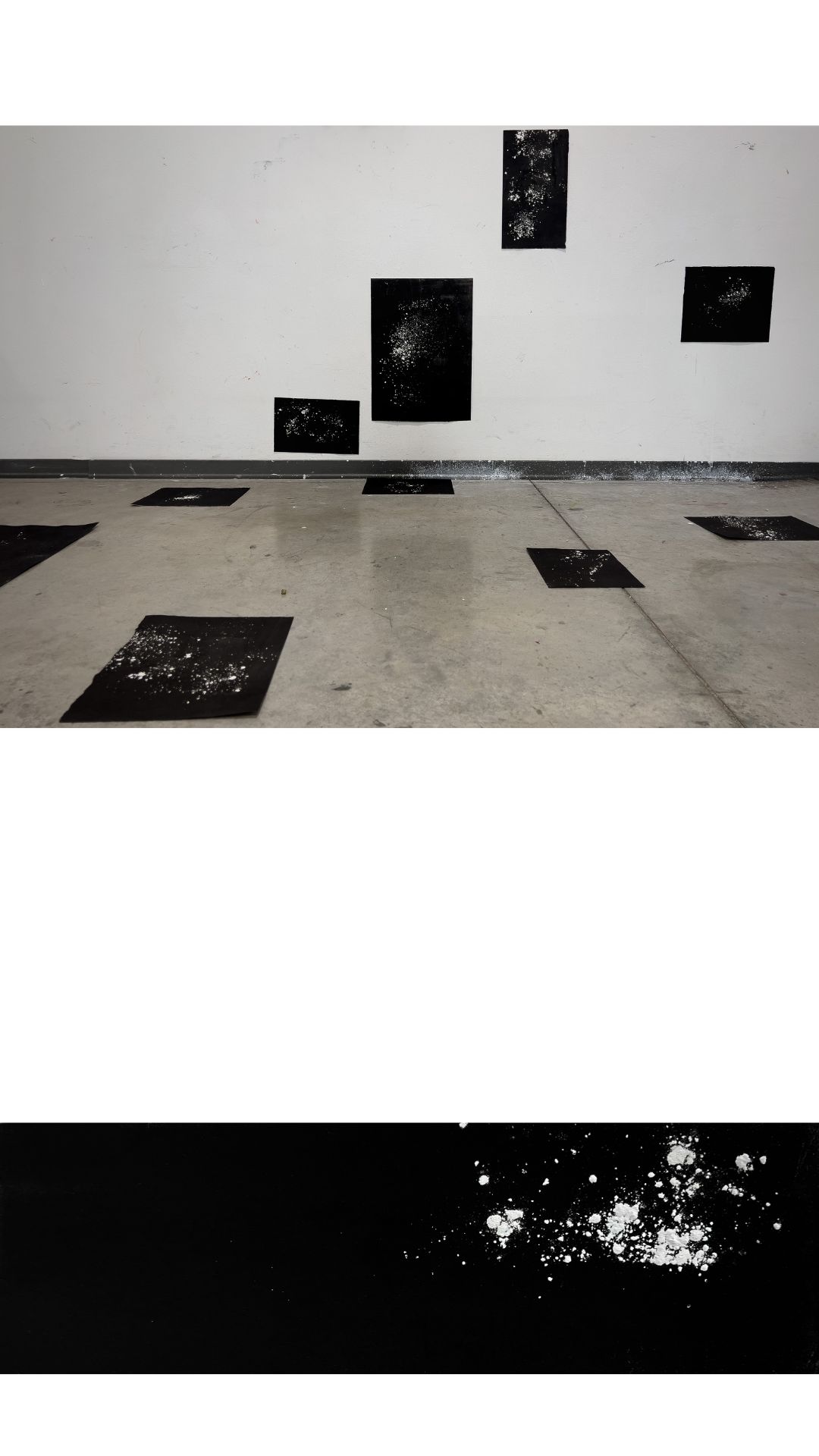 Nella stanza l’allestimento site-specific “Ombra del tempo”: monotipi realizzati tramite calcografia e cianotipia e detriti a pavimento. In questo contesto siamo all’estremo del tempo, ogni cosa che è esistita ha perso interamente la propria fisicità e ciò che ne rimane è solo un’ombra. Si tratta dell’ombra del tempo: tutta la materia è solo polvere, puntini di luce dispersi nel buio. Monotipi e detriti, insieme alle tracce di umidità e all’intonaco staccato delle pareti della stanza, creeranno così un luogo di riflessione su quanto realmente le orme dell’umanità, i segni a cui tanto teniamo del nostro passaggio sulla Terra, non siano che polvere in un universo incomprensibile.