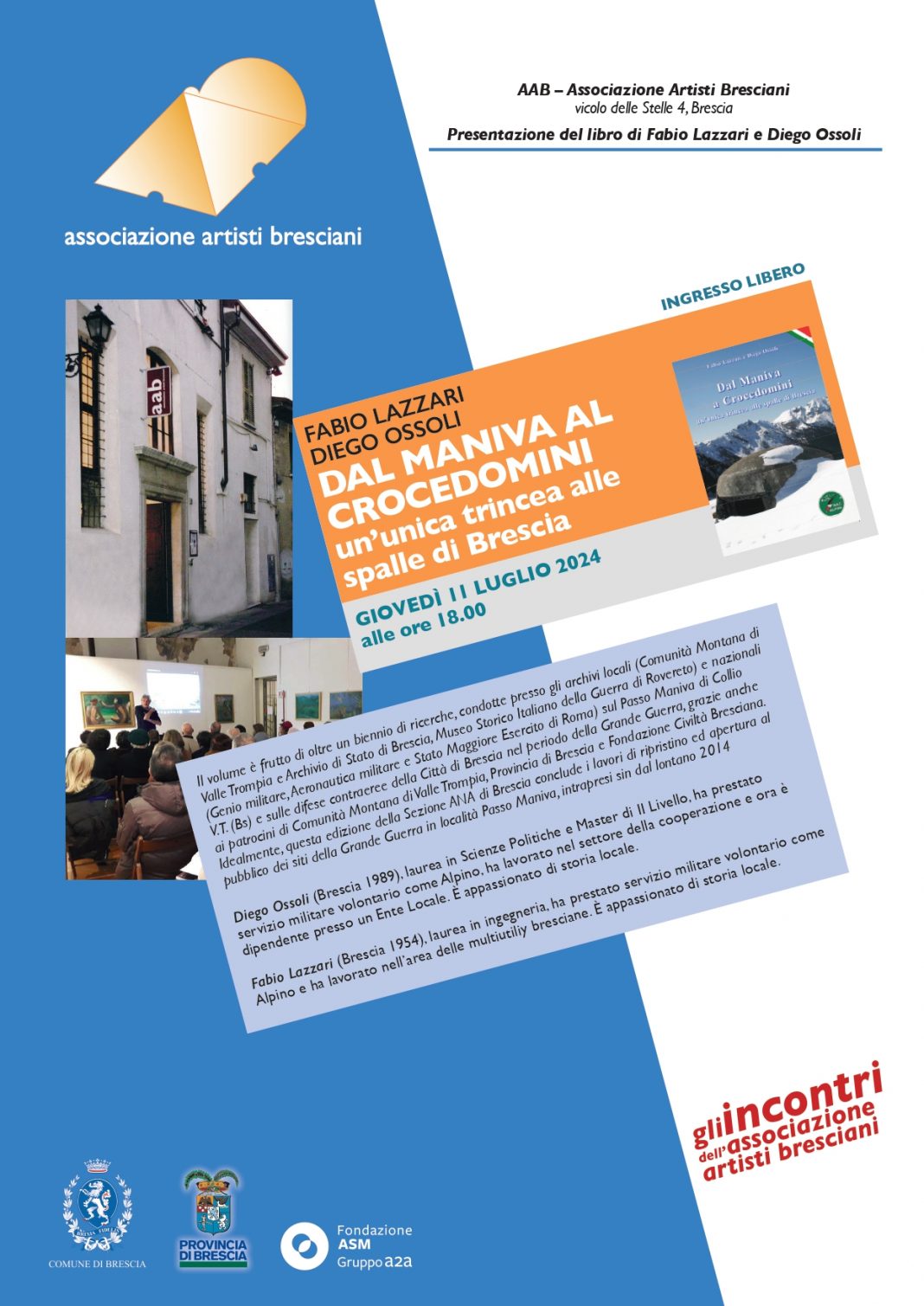 Presentazione del libro “Dal Maniva al Crocedomini – un’unica trincea alla spalle di Brescia” di Fabio Lazzari e Diego Ossoli. Il libro, accompagnato da fotografie d’epoca e documenti d’archivio inediti, racconta sia lo “Sbarramento delle Giudicarie” che la difesa contraerea della città bresciana.