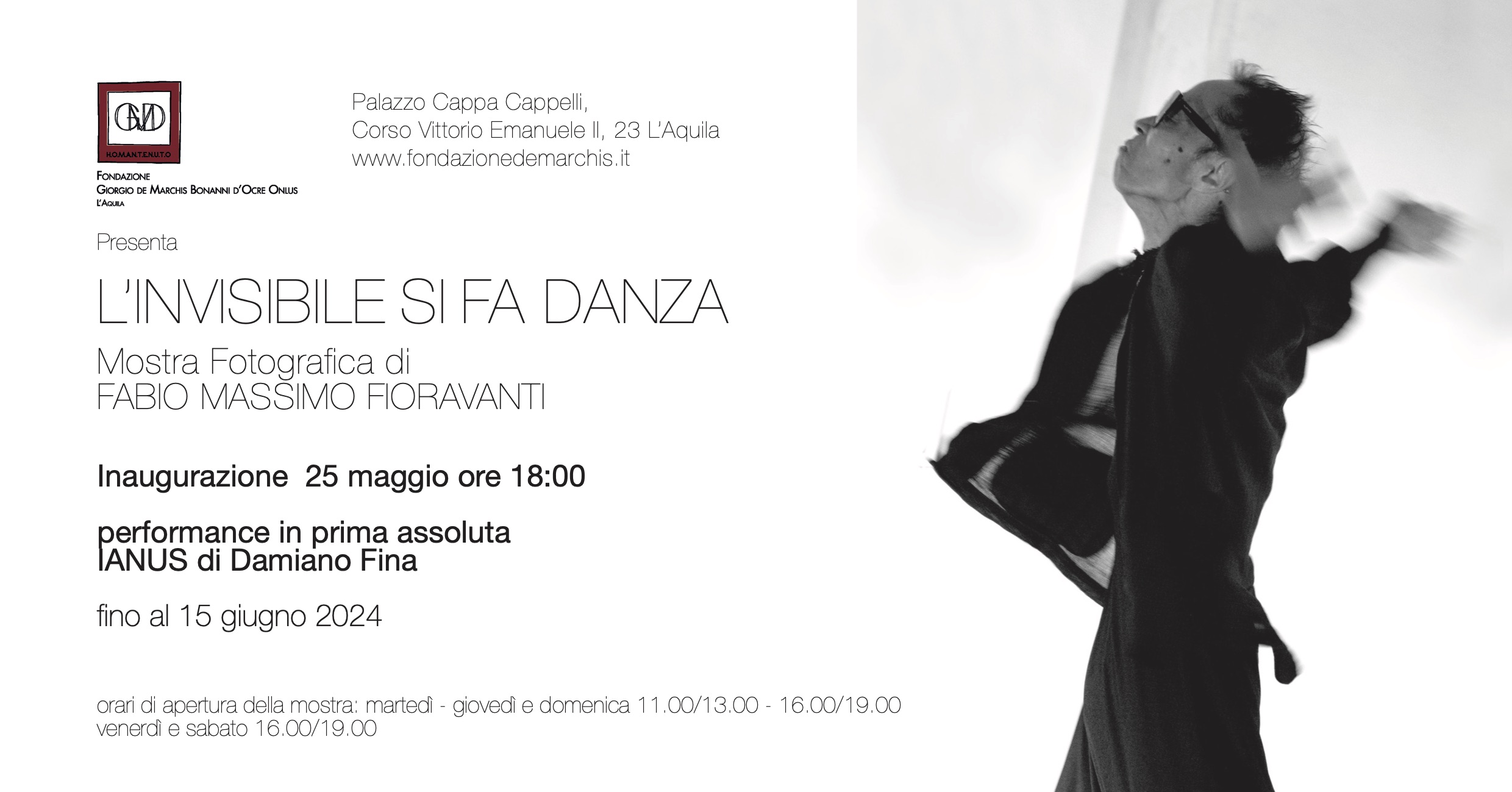 Sabato 25 maggio 2024 alle ore 18.00, presso la sede della Fondazione de Marchis, al primo piano di Palazzo Cappa Cappelli, la Fondazione Giorgio de Marchis Bonanni d'Ocre è lieta di ospitare la mostra L’invisibile si fa danza di Fabio Massimo Fioravanti.