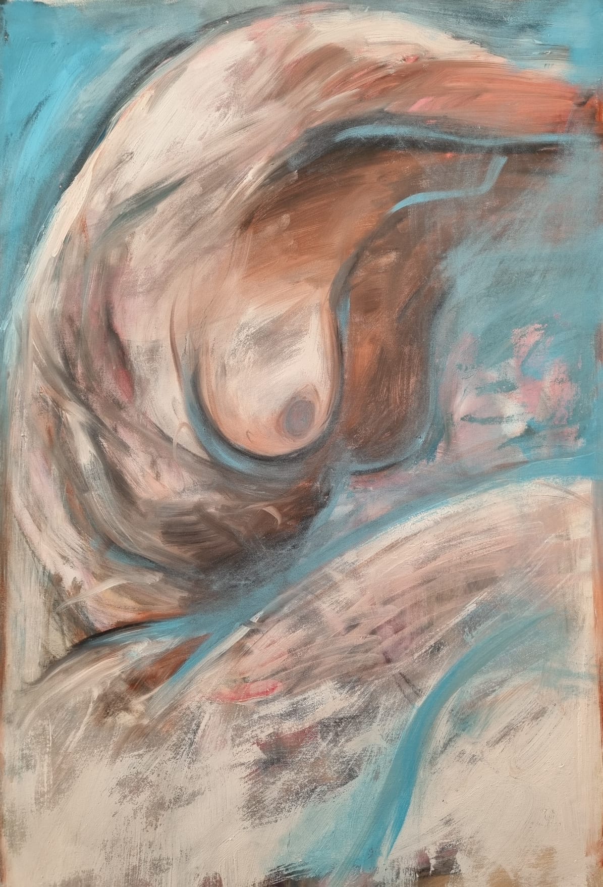 In una società che idolatra la perfezione e il controllo, nelle opere di Palazzone, l’individuo, attraverso il corpo, si ribella. I suoi corpi, nudi e segnati, non si espongono mai al giudizio estetico: appaiono seminascosti, di spalle o privi di volto, per favorire l’identificazione universale.