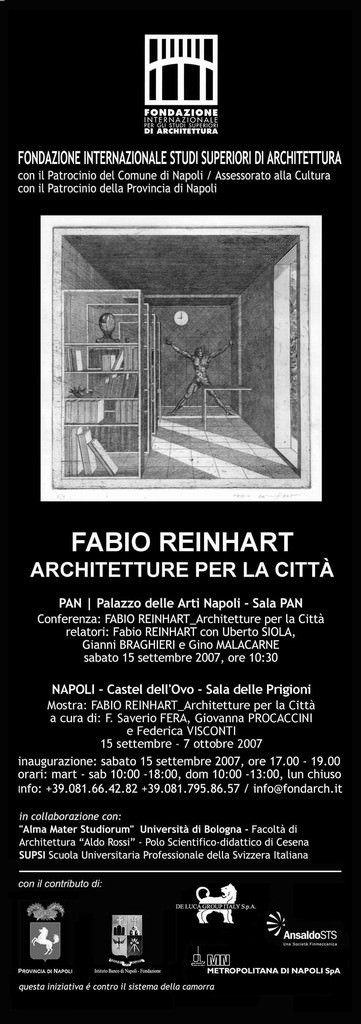 La mostra “Fabio Reinhart_Architetture per la città” è patrocinata dal Comune di Napoli / Assessorato alla Cultura e dalla Provincia di Napoli, è realizzata grazie al contributo della Provincia di Napoli, dell’Istituto Banco di Napoli – Fondazione, della MN Metropolitana di Napoli S.p.A., della Ansaldo STS e della De Luca Group Italy S.p.A., in collaborazione con la Facoltà di Architettura “Aldo Rossi” – Alma Mater Studiorum Università di Bologna - Sede di Cesena che ha ideato e promosso la mostra “Fabio Reinhart_Architettura della coerenza” a cura di F. Saverio Fera, Luca Conti, in collaborazione con la SUPSI Scuola Universitaria Professionale della Svizzera Italiana di Lugano.