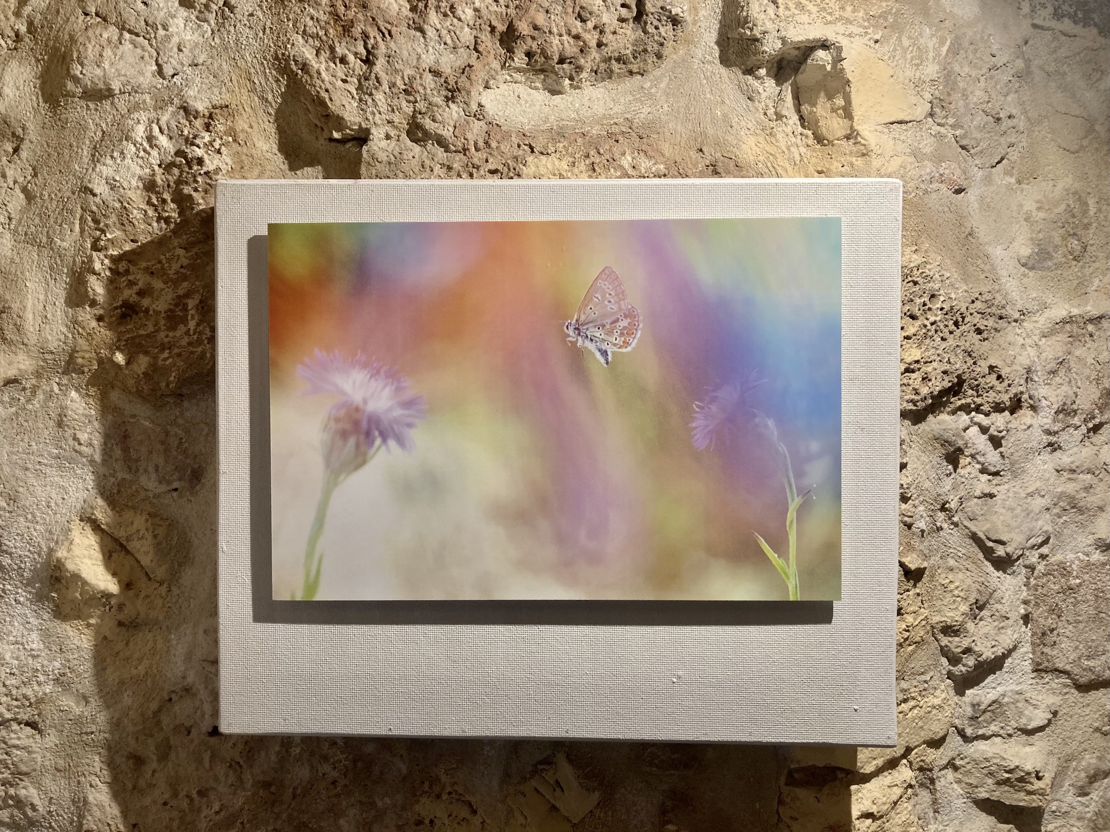Ecco, questa mostra è un omaggio alla Natura che nel dettaglio di una farfalla o di un fiore riesce a diventare arte. La sua poetica, infatti, si declina nei soggetti ripresi in primo piano, come nell’opera che apre la mostra, in cui la farfalla e il fiore creano un triangolo e lasciano trasparire la grande bellezza cromatica dello sfondo a cui appartengono.