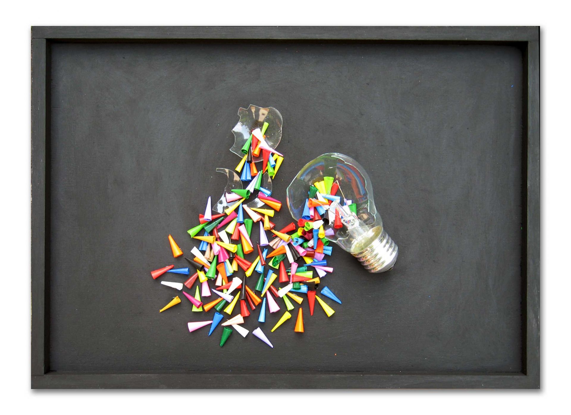Fabio Savoldi inizia nel 1985 una ricerca artistica che lo mette a confronto con materiali diversi e tecniche espressive sperimentali. Nel 2000 presenta il ciclo dei Libri e un nuovo ciclo delle Presenze, nate nel 1990, per concentrarsi, a partire dal 2006, sulla serie dei Cerini, rappresentativa del proprio lavoro concettuale. La materia, apparentemente semplice, porta l’artista ad affrontare operazioni complesse, a livello prima mentale e successivamente compositivo, che alternano i suggerimenti della realtà a quelli dell’inconscio. I Cerini funzionano mediante una destrutturazione della materia: i pastelli a cera, temperati, perdono natura e funzione originali per essere successivamente ricostruiti nell’opera d’arte, in cui si riconosce un’attenzione particolare alle cromie e al ritmo interno alla composizione. Fabio Savoldi muove i fili di un originale Big Bang dal quale si originano cieli stellati ed altri soggetti di ispirazione astronomica, da Contemporary Sun a La mia luna, dalla Nana Bianca al Buco Nero, che spesso riconducono a stati d’animo. I trucioli riempiono anche lampadine a incandescenza, così come lampade al neon, originando le Luci materiche, studi sulla natura fisica della luce.