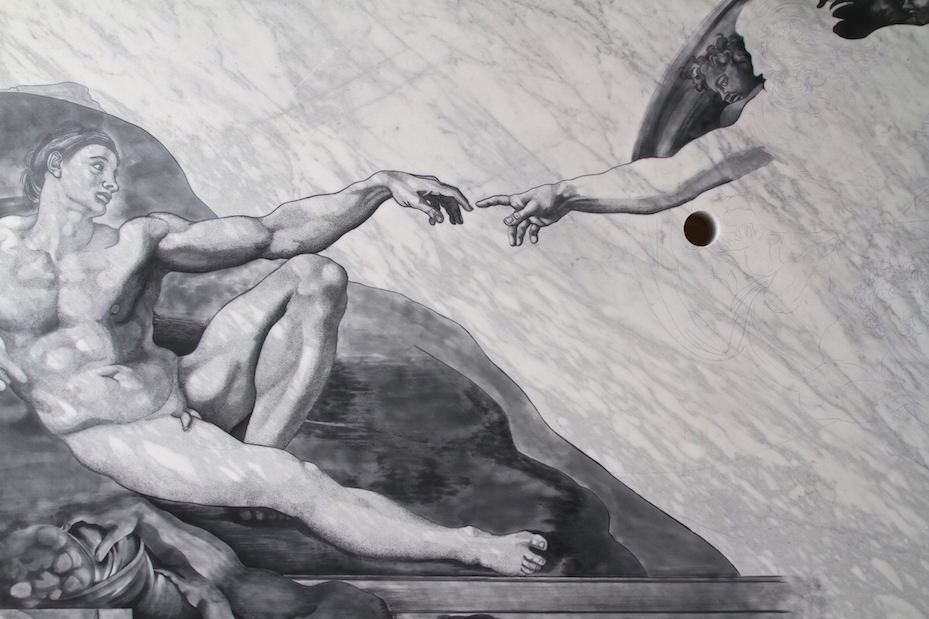 In particolare nel suggestivo spazio di via Benedetta troviamo due opere dedicate al genio di Michelangelo: una è un tavolo di grandi dimensioni, interamente realizzato in marmo bianco e tatuato con immagini tratte dagli affreschi della Cappella Sistina; mentre l’altro lavoro protagonista della project room è un bellissimo busto maschile, in marmo bianco, decorato con tatuaggi che prendono anch’essi spunto dalle scene ritratte nella Cappella Sistina.