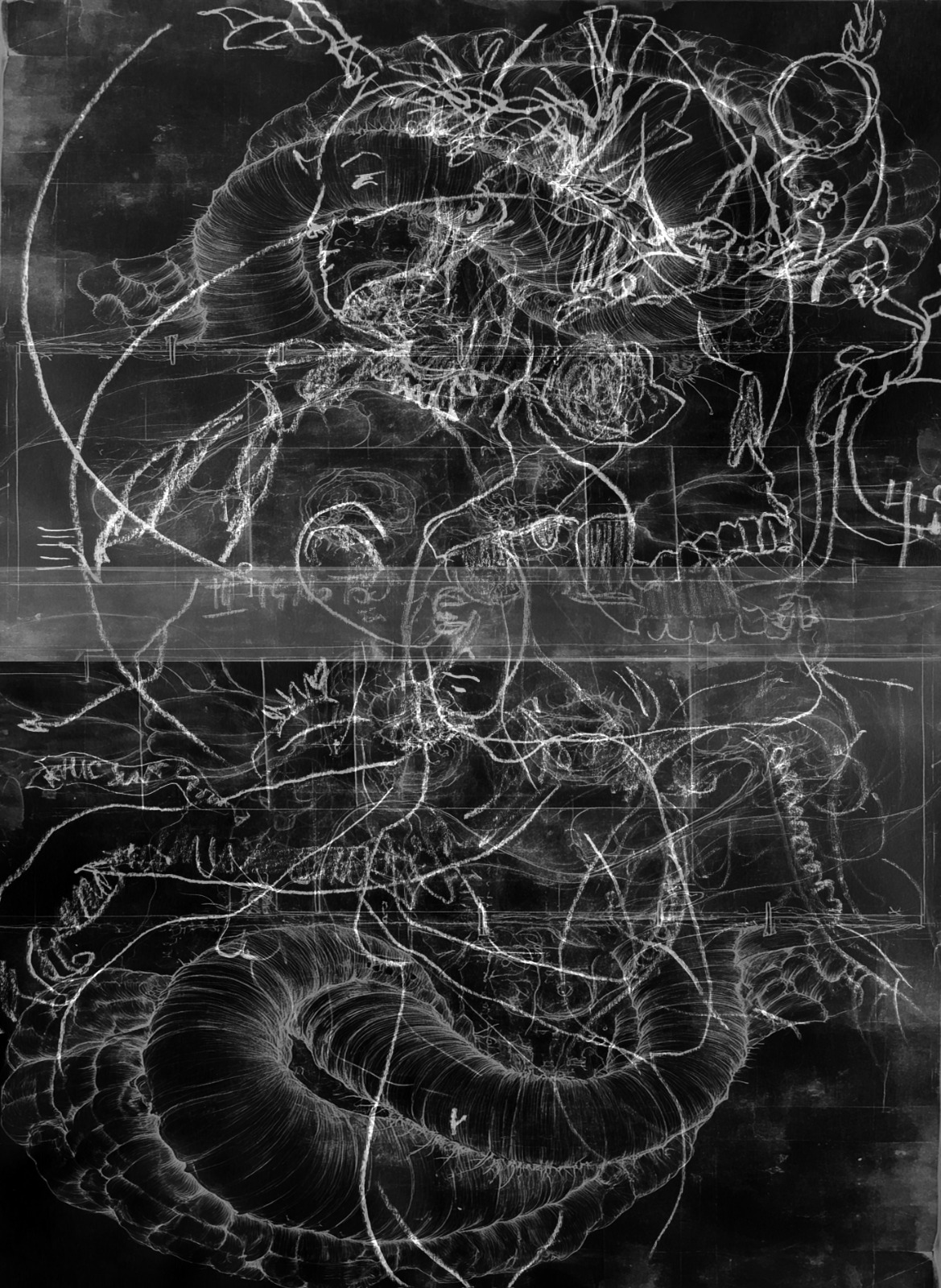 Nel primo ambiente, Ajello realizza un grande disegno murale che viene progressivamente cancellato durante il periodo della mostra, fino a riportare la stanza al suo stato originario. Questo lavoro reinterpreta il tema medievale del Trionfo della Morte in chiave contemporanea, mescolando riferimenti alla storia dell’arte antica e moderna – dai graffiti alle miniature medievali, passando per gli affreschi di Giotto fino ad arrivare ai fumetti – e l’interesse per la pratica del disegno. L’opera parietale, che presenta anche una dimensione performativa, nasce dall’incontro fra immagini create dall’artista e immagini generate con l’intelligenza artificiale, in un caos rigorosamente organizzato.