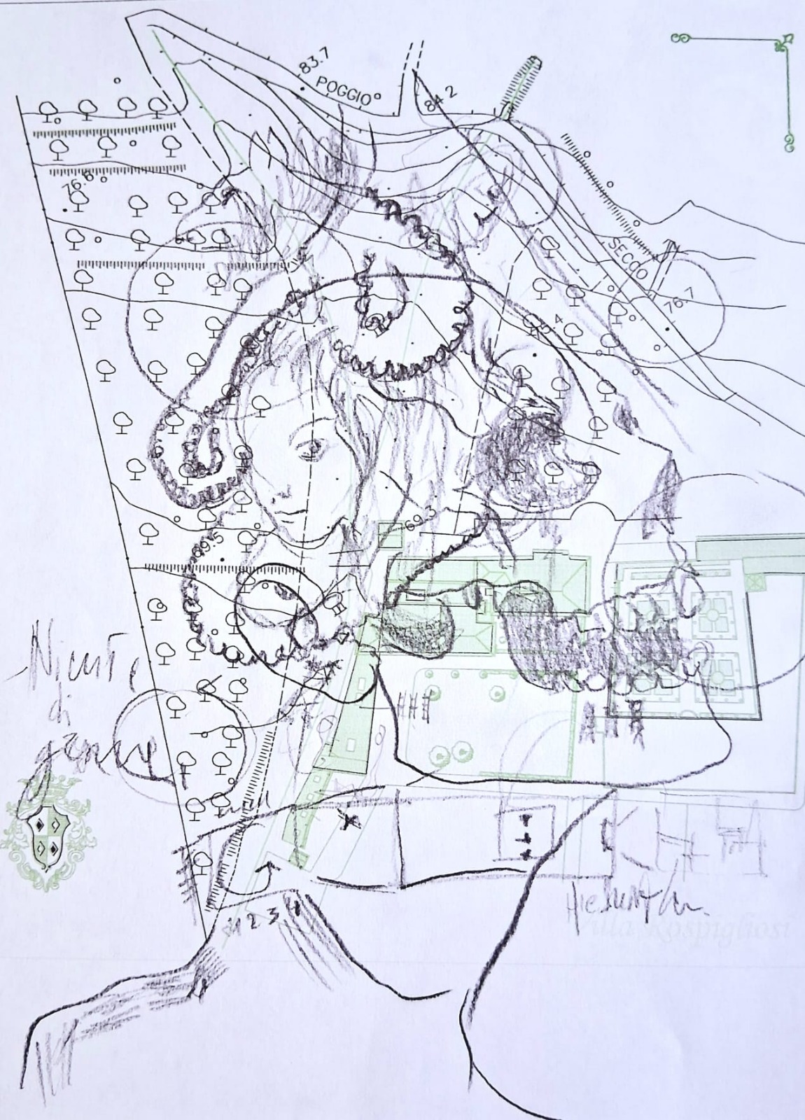 Il lavoro che l’artista propone per gli spazi di Villa Rospigliosi si compone di tre interventi connessi, disposti in un articolato percorso tematico. La mostra di Fabrizio Ajello prende avvio da un sogno legato alla scomparsa del padre architetto. Da questa memoria personale nasce un percorso che si trasforma in una riflessione più ampia sull’assenza, sul tempo e sul modo in cui le immagini – reali, ricordate o generate dall’intelligenza artificiale – costruiscono la nostra esperienza della realtà. Ajello che predilige da sempre il linguaggio dell’installazione e del disegno, utilizza qui il dato biografico e onirico come elemento “attivatore”, per poi procedere dilatando la riflessione fino a renderla universale, superando il perimetro autobiografico per muoversi su molteplici piani rappresentativi.