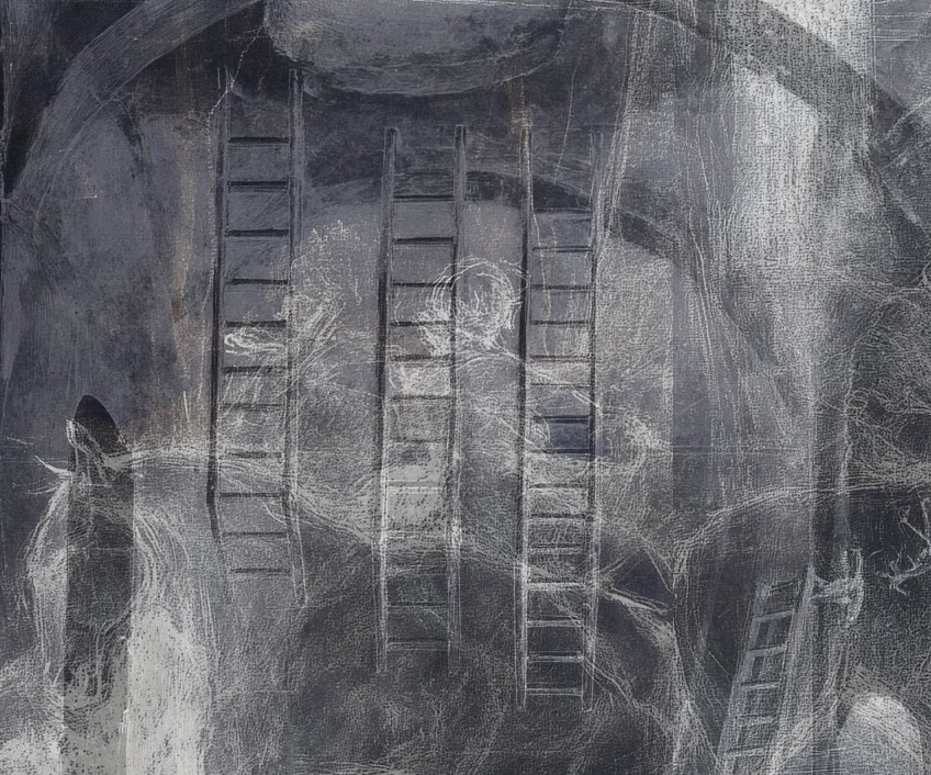 Nella terza sala, il percorso si completa davanti all’ultimo dipinto realizzato dal padre dell’artista, che raffigura una stanza sospesa tra presenza e sparizione. Tre scale di legno appese a una corda richiamano il tema della Deposizione ma, in assenza di un corpo, diventano simbolo di un’ascesa impossibile, o forse di un ritorno alla terra. Sono scale che parlano anche del lavoro, del gesto quotidiano, di ciò che rimane dei padri: gli oggetti, i segni, i saperi tramandati.