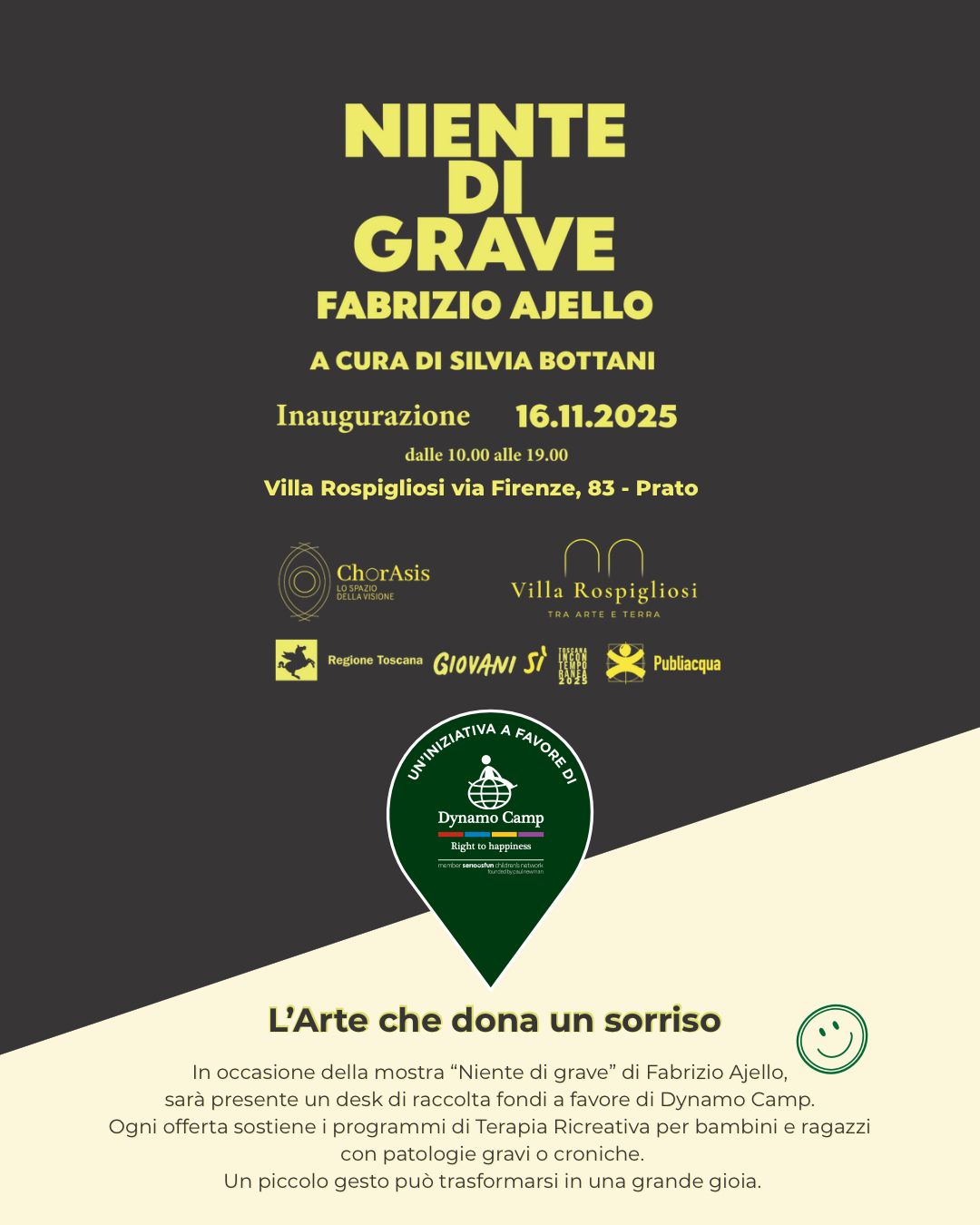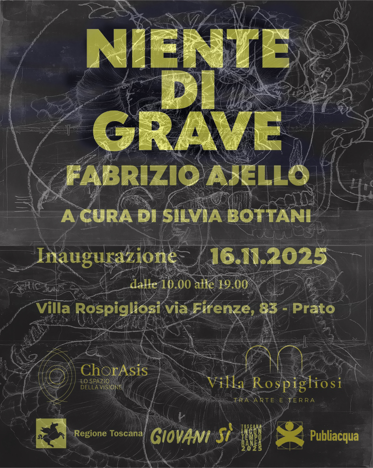 ChorAsis presenta NIENTE DI GRAVE, il progetto realizzato da Fabrizio Ajello per gli spazi espositivi della Villa Rospigliosi di Prato. La mostra, a cura di Silvia Bottani, è visitabile dal 16 novembre al 31 gennaio, promossa e sostenuta dalla direzione di Chorasis-LoSpaziodellaVisione con il contributo di Toscanaincontemporanea2025 e Publiacqua.