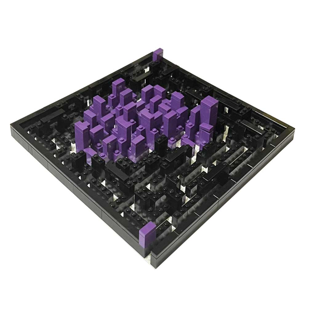 Si tratta di “dedali”, di “maze” (multicursali, complessi, ramificati). E non di “labyrinth” (unicursali). Cioè ci si può perdere per davvero tra i bivi e gli innumerevoli percorsi possibili, tra torri che cercano simmetrie, citazioni e colori che assumono significati differenti a seconda del punto di vista (frontale o prospettico), giocando con affascinanti citazioni dell’arte cinetica del Novecento, con lo spirito squisitamente pop dei mattoncini Lego e con il concetto di architettura in senso lato.