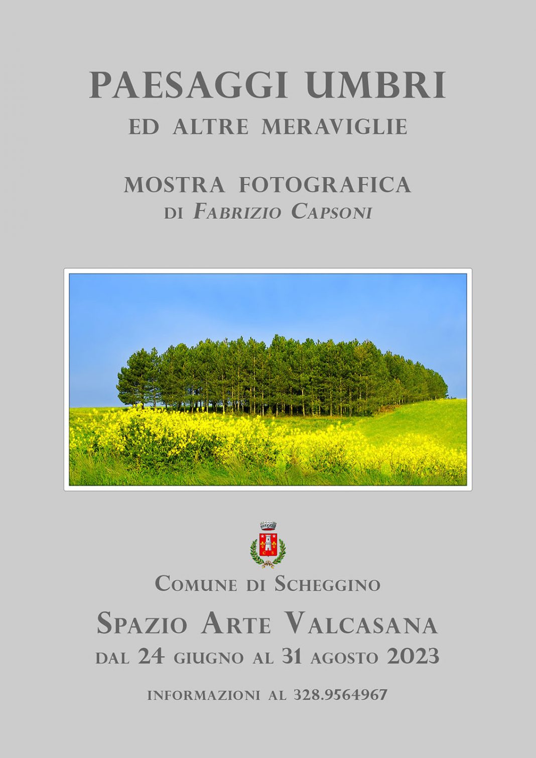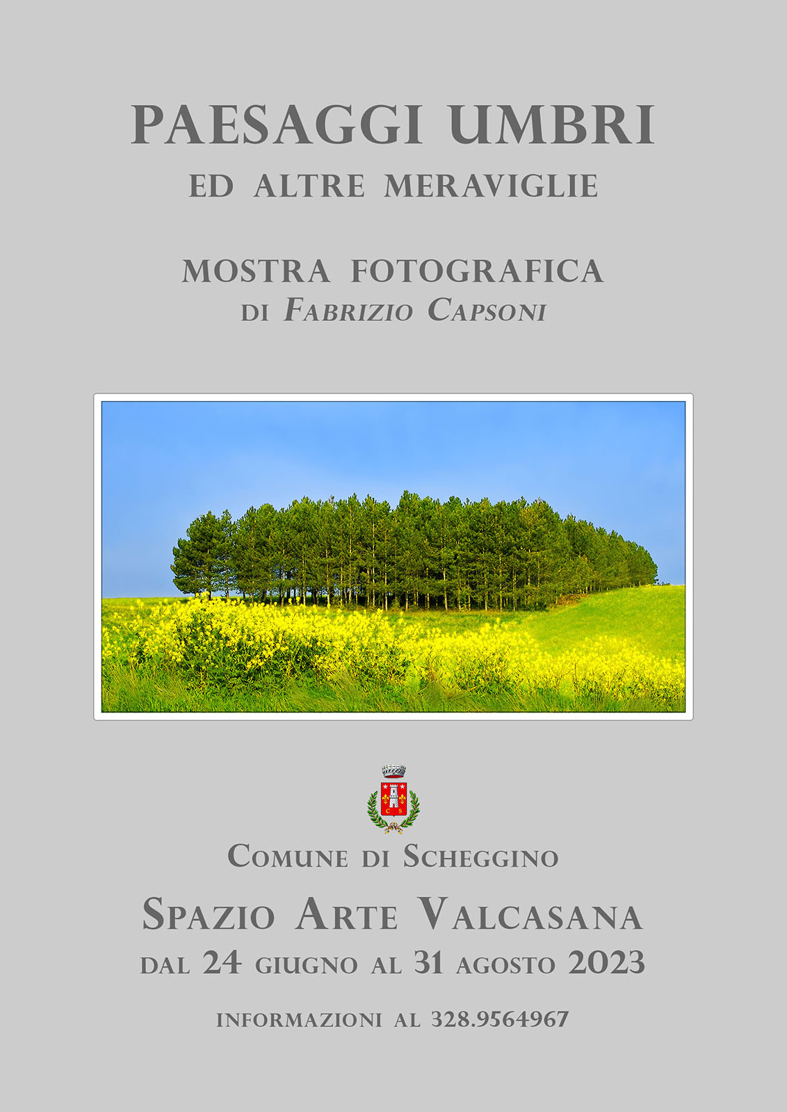 Si è aperta domenica 25 giugno nello Spazio Arte Valcasana di Scheggino (PG) alla presenza del Sindaco Fabio Dottori e di altre autorità, la Mostra Fotografica "Paesaggi Umbri ed altre meraviglie" di Fabrizio Capsoni, una miscellanea di lavori estratti dalle serie “Campi di Maggio”, “Stormi” e “Querce” realizzate dal fotografo tra il 2005 e il 2020, sempre in Umbria, che ripropongono la natura in una chiave di lettura inusuale e più intima.