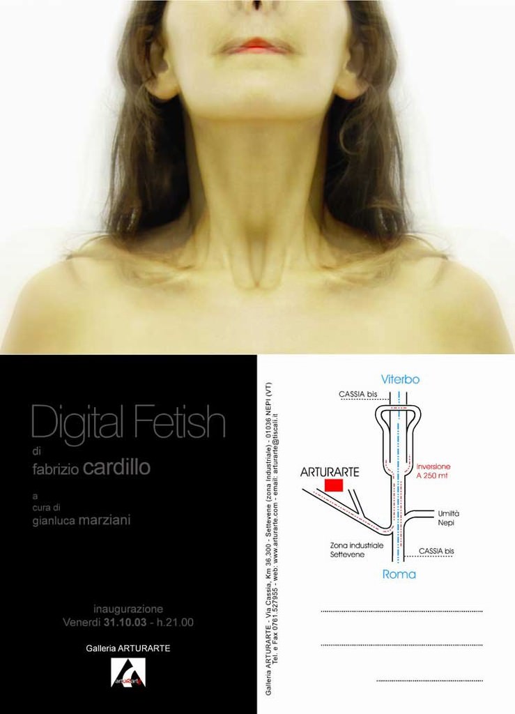 Inaugura, venerdì 31 ottobre 2003 presso la Galleria Arturarte, la mostra personale di FABRIZIO CARDILLO dal titolo “Digital Fetish”. Si tratta dell’esordio espositivo di un autore che ha scelto la sperimentazione elettronica, narrando la propria idea del corpo femminile. Le sue stampe focalizzano la figura con prospettive centrali e movimenti interni alla singola immagine, come se il gesto montasse i frame dentro la singola inquadratura.