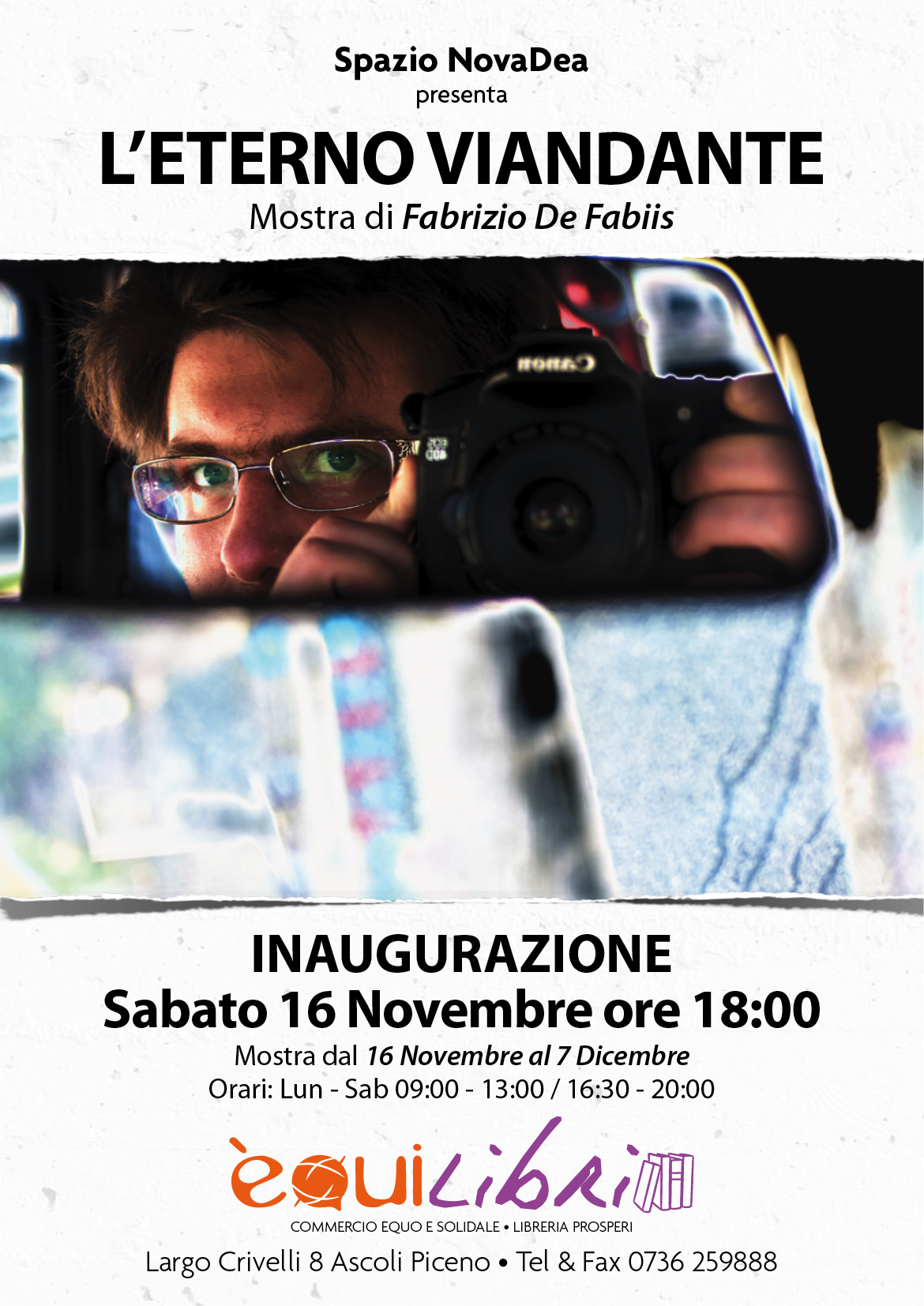 Sabato 16 novembre 2013 alle ore 18.00 ad Ascoli Piceno presso èquilibri, che unisce l'associazione AscoliEquoSolidale e la Libreria Prosperi, verrà inaugurata la personale L'ETERNO VIANDANTE del fotografo Fabrizio De Fabiis, a cura di Daniele De Angelis. L’evento sarà anche occasione per presentare l’omonimo libro da cui sono tratte le foto esposte, che pochi mesi fa l’artista ha pubblicato per Sigismundus Editrice. Alla serata parteciperà l’autore.