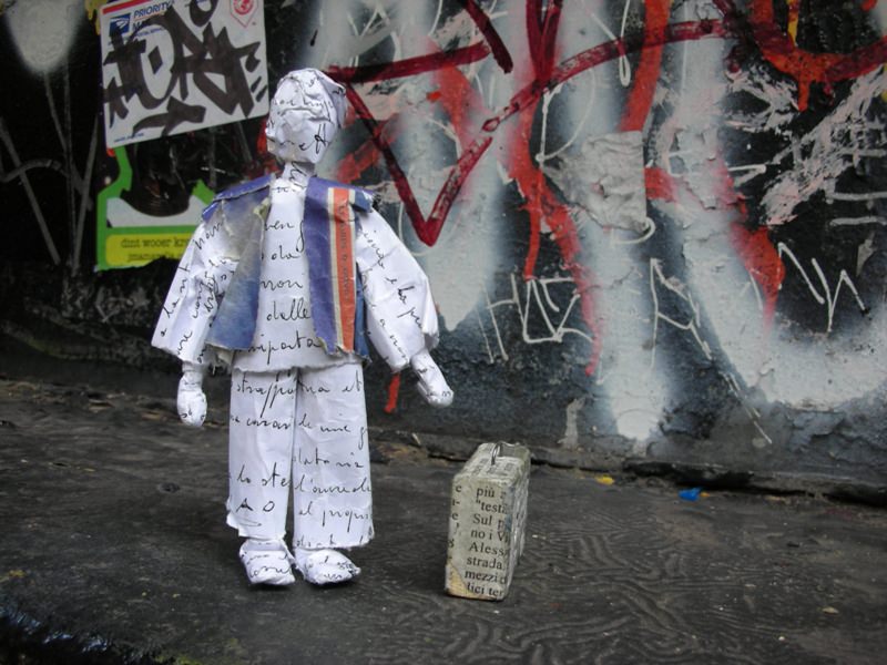 La sua arte possiede la dimensione evocativa della poesia, del racconto, i tempi e i ritmi sospesi di un canto che nasce e si sprigiona dalle cose che rappresenta, l’omino di carta, gli innesti metallici, i colori dei materiali utilizzati.