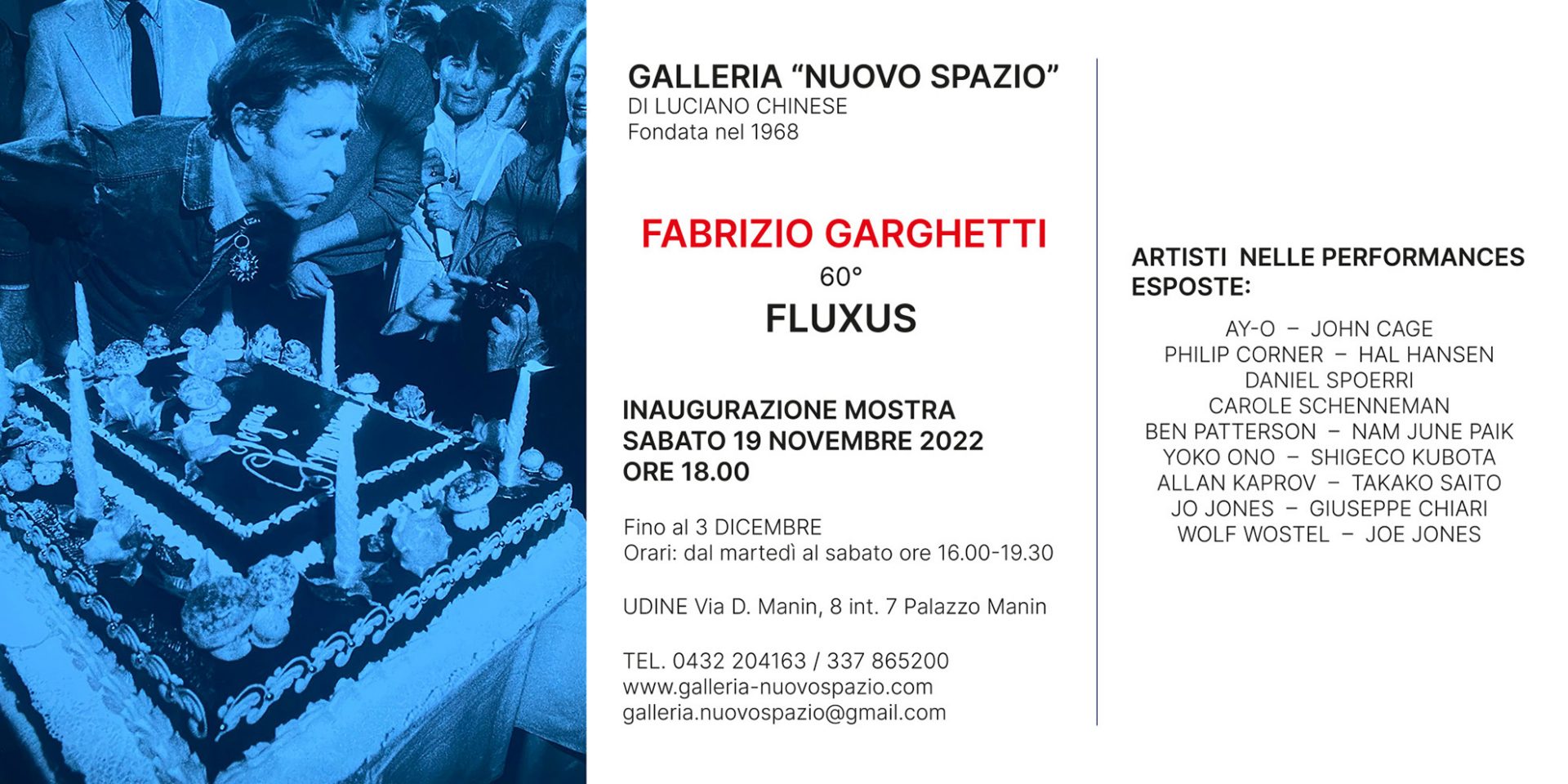 Gli artisti di Fluxus presentati alla galleria “Nuovo Spazio” di Udine attraverso le fotografie di Fabrizio Garghetti sono Ay O, John Cage, Philip Corner, al Hansen, Daniel Spoerry, Carole Schenneman, Ben Patterson, Nam June Paik, Yoko Ono, ShigekoKubota, Allan Kaprov, Takako Saito, Jo Jones, Giuseppe Chiari, Wolf Wostel, Joe Jones.