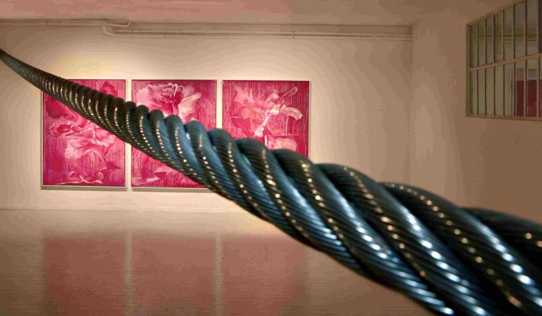 Un unico filo lega tutti i nuovi lavori esposti a Verona, a partire dalla linea metallica del cavo teso con cui l’artista fende lo spazio: un taglio netto, a mezz’aria, che mantiene due parti invisibili in vibrante equilibrio. Il visitatore si ritrova impegnato a conquistare il centro dello spazio, ma la fune non ne ostacola la visione. La corda tesa dell’equilibrista impone all’occhio di rimbalzare costantemente fra le pitture alle pareti e l’acciaio riflettente. Il vuoto viene così colmato da un crescendo di energia che culmina nel trittico del rossore, dove giunge a una instabile oggettivazione. In un altro luogo il filo si inspessisce facendosi corda colorata che a sua volta si annoda e aggroviglia come un inestricabile gomitolo di interrelazioni. In quest’ultima forma, la corda coi suoi nodi aveva fatto la sua comparsa già nell’autunno 2018 nell’imponente installazione ambientale Rosario delle Assenze all’interno dell’ex-caserma di Santa Marta. Nuovo cuore pulsante dell’edificio premiato alla Triennale per il restauro conservativo, due masse di corde roteano nello spazio a velocità quasi impercettibile creando un campo energetico che pervade ogni visitatore, ogni pietra dell’antico edificio.