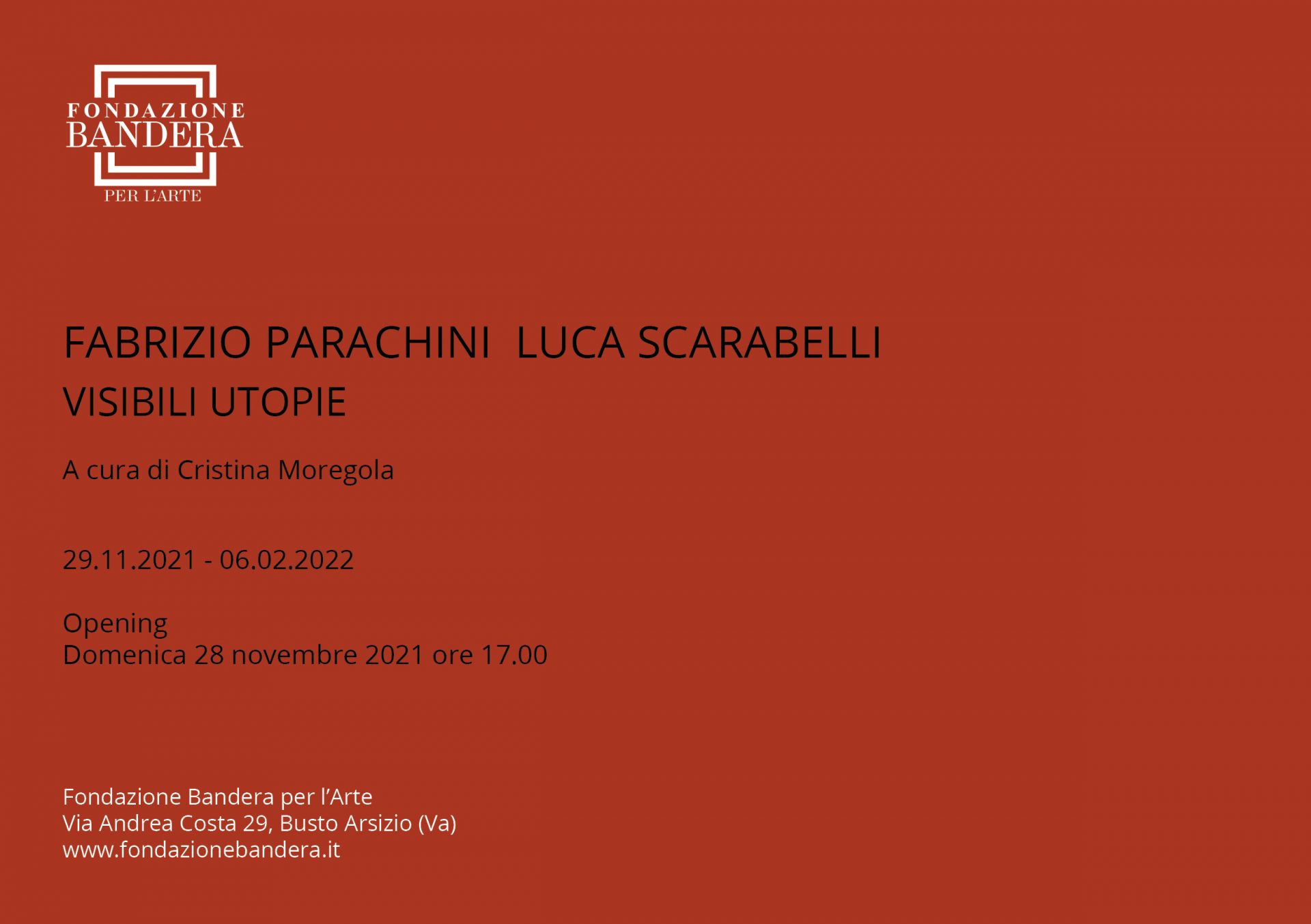 La Fondazione Bandera per l’Arte è lieta di presentare domenica 28 novembre 2021 alle ore 17.00 la doppia personale Fabrizio Parachini Luca Scarabelli Visibili Utopie. La mostra progettata nel mese di febbraio 2021 in occasione della XVII edizione di Filosofarti ma mai aperta a causa dell’emergenza sanitaria, viene ora proposta con un allestimento ulteriormente arricchito di nuove opere e aderisce, sabato 11 dicembre, alla Diciassettesima Giornata del Contemporaneo promossa da AMACI - Associazione dei musei d’arte contemporanea italiani che coinvolge musei, fondazioni, istituzioni pubbliche e private, gallerie, studi e spazi d’artista per raccontare la vitalità dell’arte contemporanea nel nostro Paese.