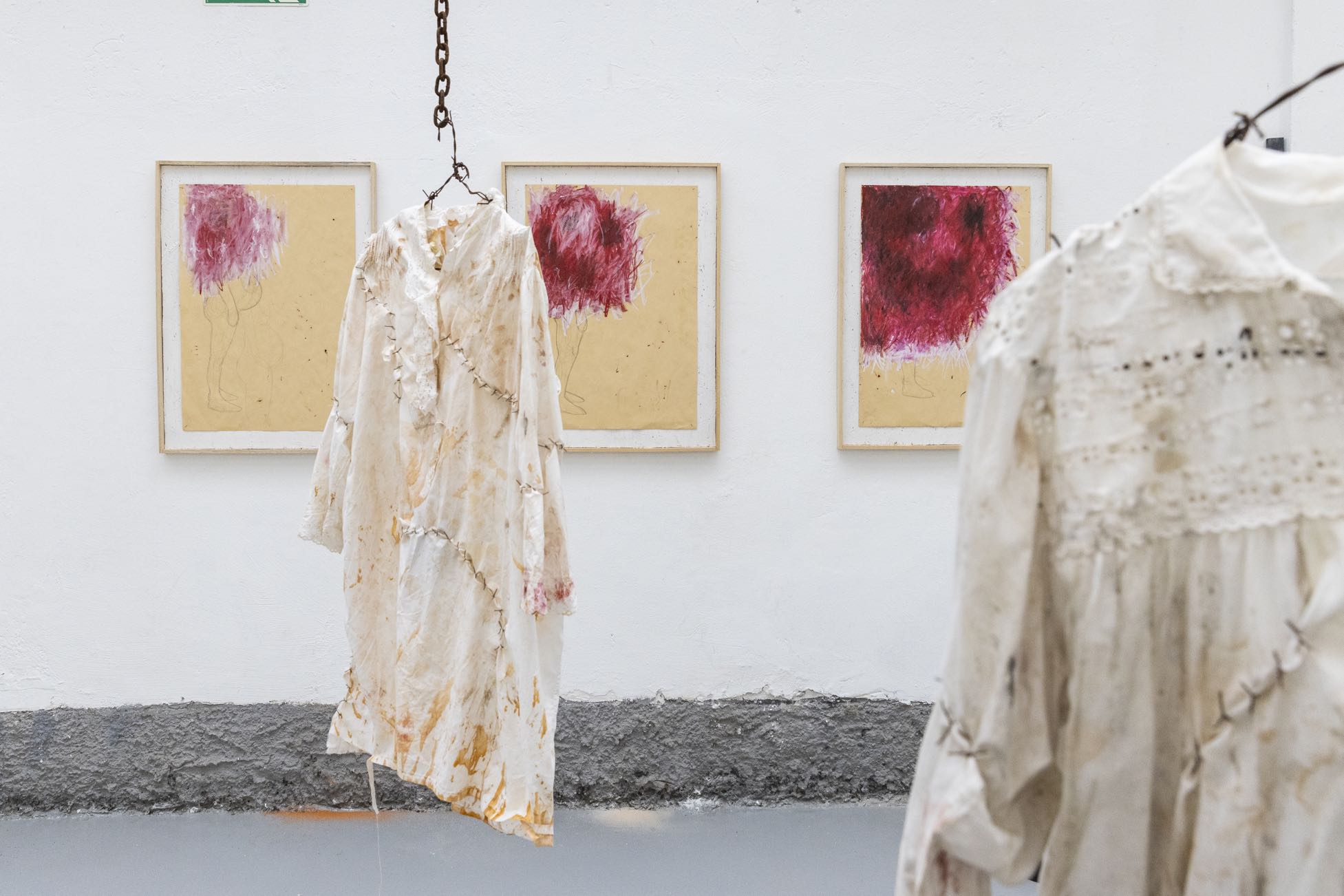 Fabrizio Pozzoli crea un piccolo esercito di abiti feriti e martoriati, ricuciti e suturati, ma che portano ancora i segni delle offese nelle grandi macchie rosse e rugginose. La ruggine, il ferro e le catene aggiungono suggestione a un racconto che ci costringe a interrogarci sul valore della persona, sulla sua inviolabilità e sui limiti che vengono costantemente valicati, mentre una serie di lavori a parete, ancora, parla della delicatezza del corpo e di quanto sia facile ferirlo.