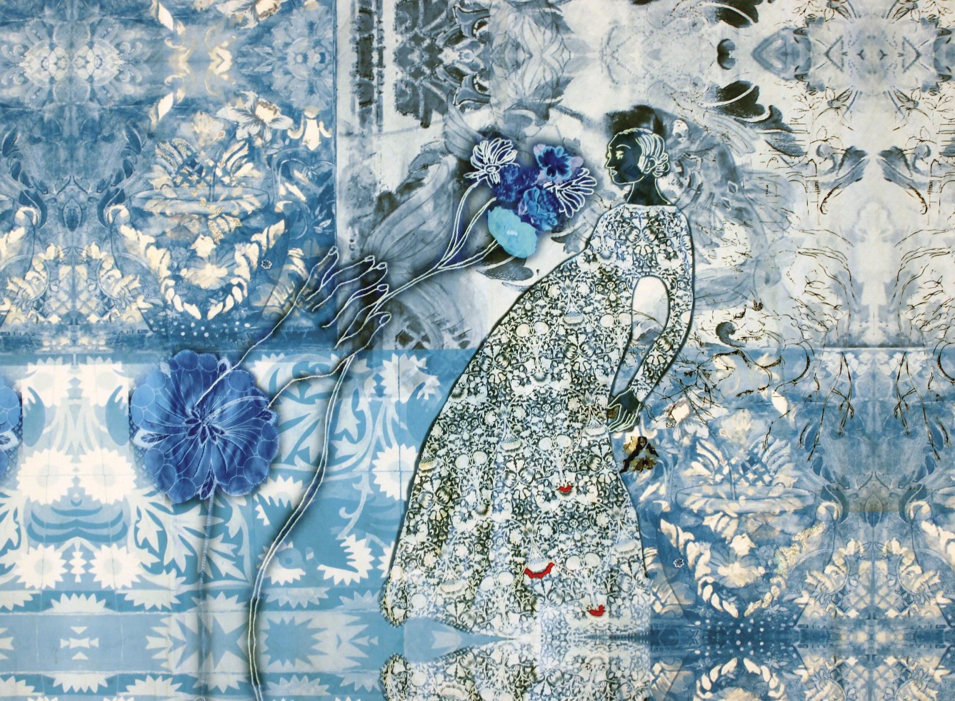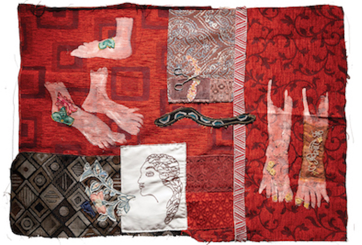 La stoffa è anche al centro del lavoro di Loredana Galante. Una stoffa che si fa veicolo fluttuante e trasparente di corpi che pure nella frammentazione mantengono una delicatezza fatata. Ma stoffa anche per intarsi potenti, carichi, densi di memorie antiche, così come a suggestioni antiche fa riferimento la fanciulla fatta di fiori che si offre vulnerabile agli sguardi. Mentre gli oggetti, i ritmi e le memorie della casa raccontano con grazia quello che per anni è stato il regno delle donne e dei loro segreti.