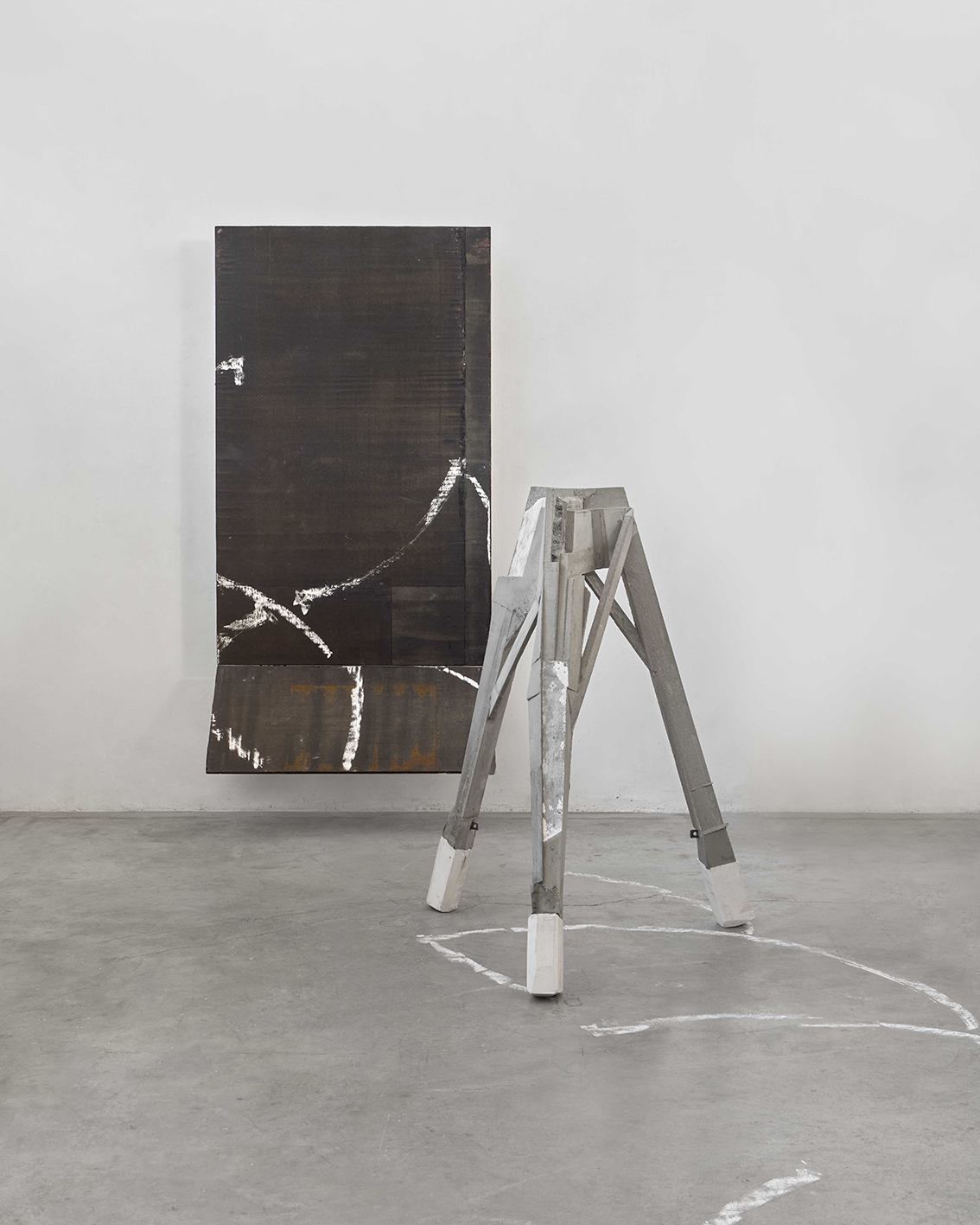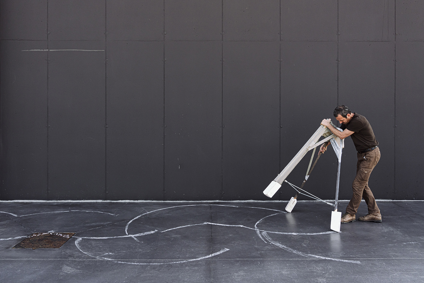 Per Classica, questo il titolo della mostra, Prevedello ha infatti introdotto nel proprio repertorio una dimensione marcatamente performativa: le opere presentate nel primo dei due ambienti che compongono la galleria sono il frutto di una "danza" che l'artista ha compiuto abbracciando una scultura-compasso e solcando con i propri passi delle superfici in bitume. I segni di colore chiaro su fondo scuro sono la traccia di questa azione: linee astratte, incerte e frastagliate, in cui il linguaggio scultoreo, caro a Prevedello, trova un inatteso sodalizio con la performance e persino la pittura. In questo senso, il titolo, Classica, rimanda ai passi di danza compiuti dall'artista per realizzare questo nuovo ciclo di opere, stretto in un abbraccio carnale e insieme romantico con la scultura.