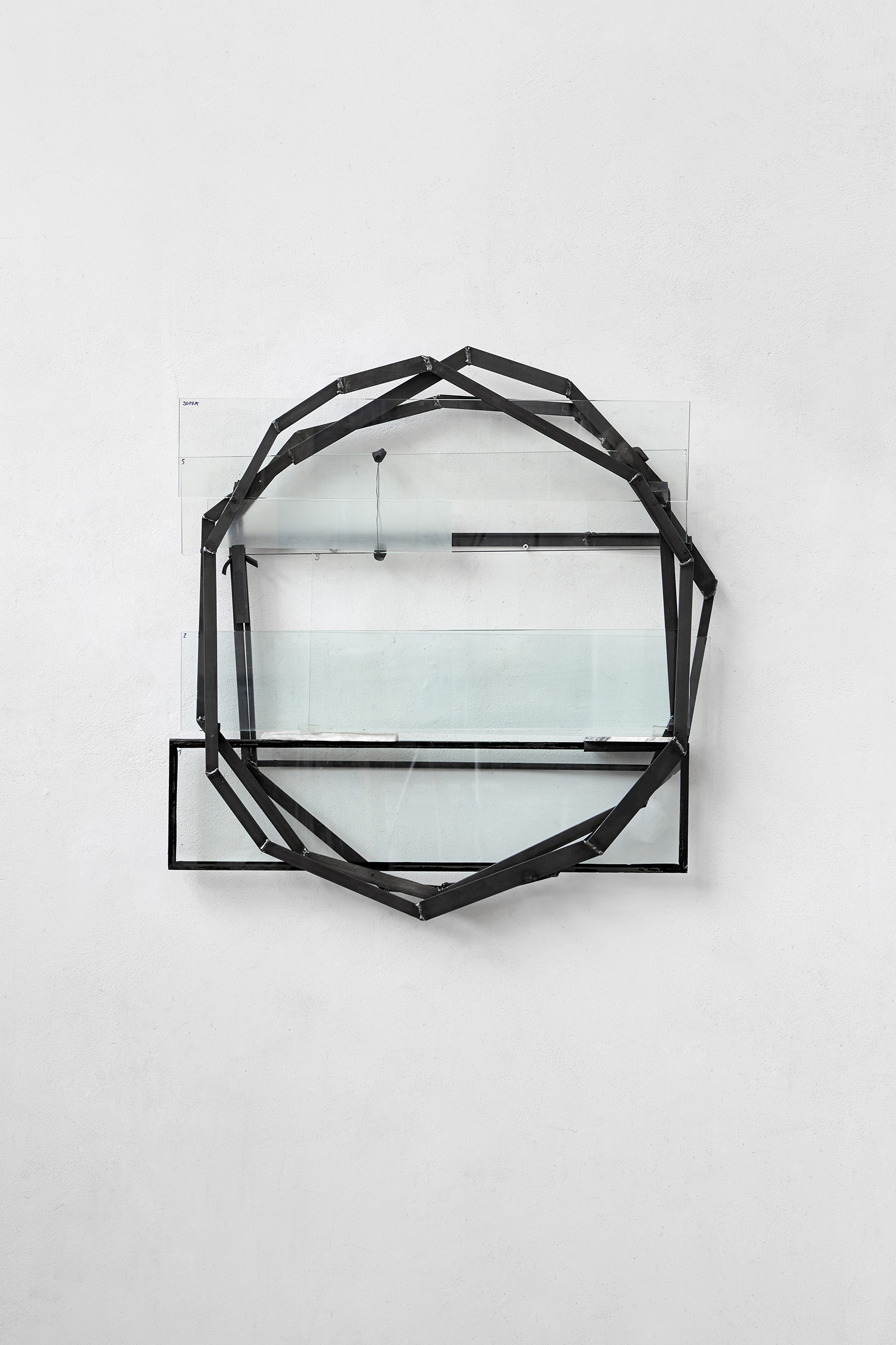 Per Prevedello la scultura diventa un dispositivo che riconfigura la visione di un luogo: è così che, per esempio, Cerchio (243), scultura a parete in ferro, marmo e vetro, apre la mostra presentandosi come un vero e proprio dispositivo del vedere, uno spazio, circoscritto da un cerchio dato dalla sovrapposizione di tre poligoni, che idealmente suggerisce una finestra/oblò davanti o dietro a cui siamo posti per un’osservazione privilegiata di ciò che ci circonda. Cerchio è anche un paesaggio che, alla stregua della finestra albertiana, suggerisce una profondità data dalle diverse stratificazioni delle lastre di vetro. Lo spazio, così centrale nella riflessione sulla scultura, in queste opere si costruisce così per giustapposizione di elementi di diversa solidità, allo stesso tempo fragili e resistenti, effimeri, apparentemente precari, in grado di visualizzare l’interrelazione tra narrazioni fisiche e mentali.