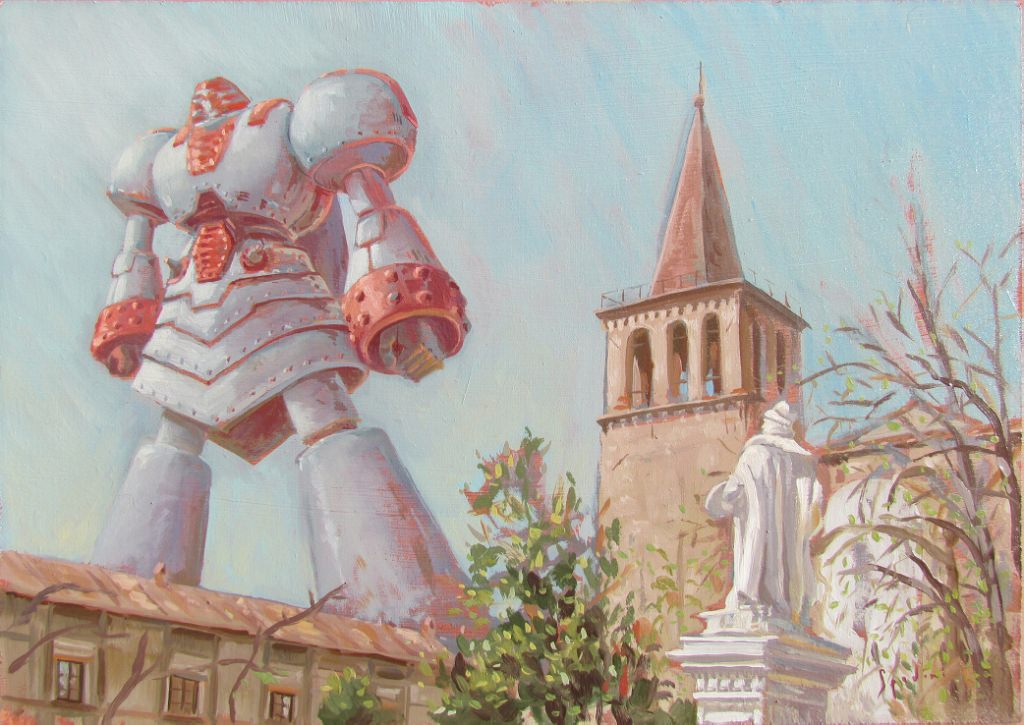 I giganti di metallo, robot dell'illustrazione nipponica della seconda metà del XX secolo, si insinuano così nella pittura verista macchiaiola. Quest'elemento epico però non è mai rappresentato in pose dinamiche, anzi, appaiono spesso come relitti polverosi, arrugginiti, reperti archeologici di un mondo estraneo.