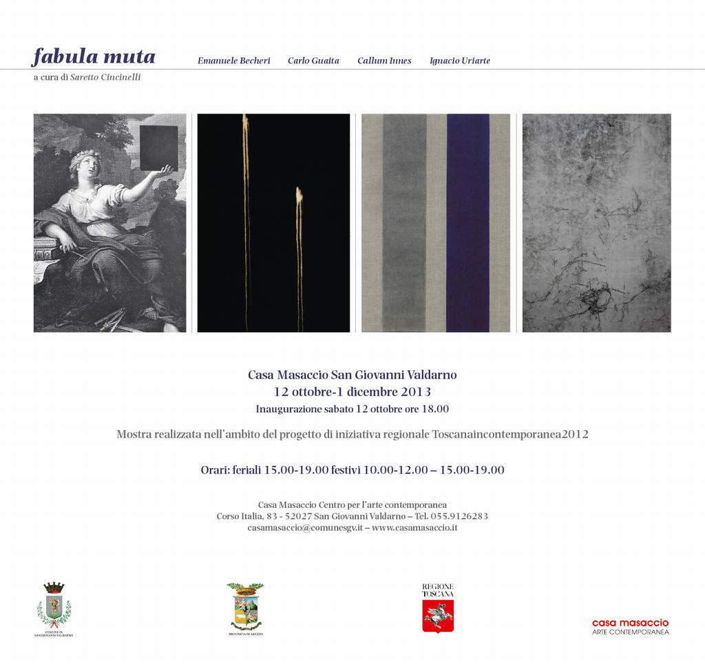 Pur non configurandosi come un discorso a largo raggio, Fabula muta che presenta opere di Emanuele Becheri (Prato 1773), Carlo Guaita (Palermo 1954) , Callum Innes (Edinbourgh 1962), Ignacio Uriarte (Krefeld 1972) parla a più voci: l’intento che muove la mostra non è tanto quello di fondare un territorio immediatamente riconoscibile quanto quello di inaugurare uno spazio di transito in cui sia possibile ri-pensare, oltre le diversità stilistiche, eventuali affinità nascoste fra le pieghe di differenti poetiche. Più che avvicinare un artista all’altro (le distanze generazionali geografiche e poetiche sono lì per attestarlo) Fabula muta si propone di mostrare la vicinanza di alcuni procedimenti generativi (la cancellazione, la traccia, la ripetizione differente …) che inscritti nelle singole opere permettono un comune allontanamento di ciascuna di esse dalla confusione che regna sull’attuale scena dell’arte a proposito della pittura.