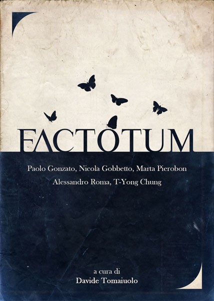 Factotum è una parola composta, di etimologia latina, che significa fai tutto. Nel 1975 Charles Bukowski ne trae un romanzo, avventuroso, osceno, divertito, disperato, sboccato ma nel contempo fortemente lirico. Il factotum pensato dall’ autore è lo stereotipo di una vita randagia, un indole che si muove nel suo mondo rapito da un fatalismo creativo e mosso da uno spirito di sopravvivenza paradossale. Il protagonista agisce in una continua resa e sconfitta, ma nonostante questo è un indole che vive con una silenziosa capacità di trasfigurare l’una e l’altra nel raggiungimento dei suoi obiettivi, slegandosi dai codici semantici imposti dalla società. La trasposizione di questo pensiero in modalità esecutiva è la traccia data per la sperimentazione del lavoro a cinque giovani artisti ( Paolo Gonzato, Nicola Gobbetto, Marta Pierobon, Alessandro Roma, T. Yong Chung ), nel tentativo di esaltare il fare senza dire.