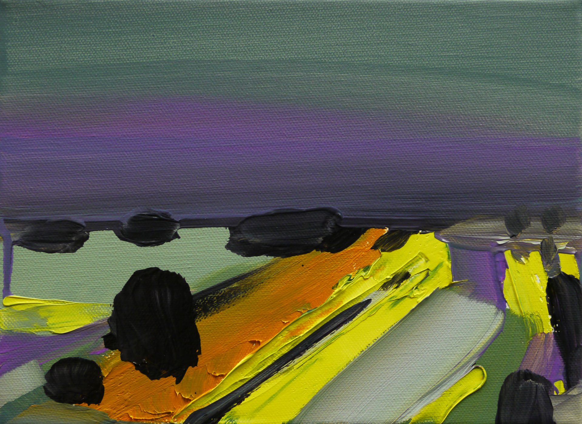 Il risultato avvincente dei suoi paesaggi immaginari è la presenza nitida di passaggi di colori urlati e violenti, dai gialli ai verdi salvia dei prati, al blu violetto dei laghi, all’arancione delle distese, utilizzando il colore nero più cupo nel dipingere alberi, cespugli, oppure blocchi che richiamano monoliti.