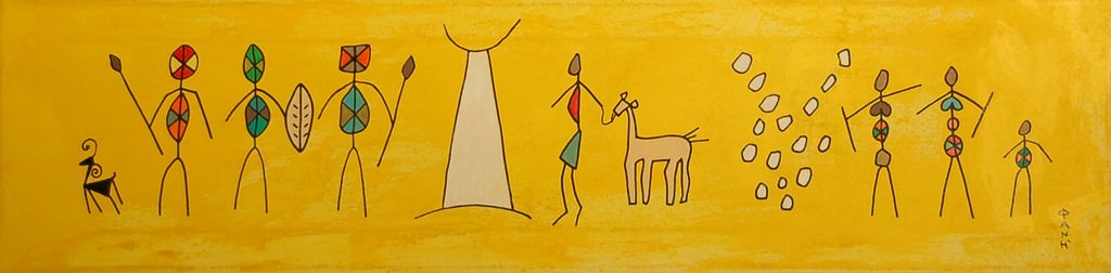 Le sue opere, calde e variopinte, ricordano le primitive figure dell’arte, quelle che possiamo ritrovare nelle incisioni rupestri o nelle più antiche pitture vascolari