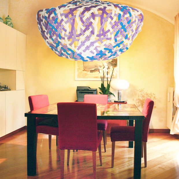 Fanus è una scultura aerea, leggera, con un’ anima in ferro arancione su cui si posa un intreccio di sei corde di sei colori diversi. Un modulo ripetuto che porta la mente alla meditazione e a perdersi in forme e curve armoniche che creano un sottile gioco di luci e ombre dando allo spazio un’ eleganza delle sensazioni orientali.