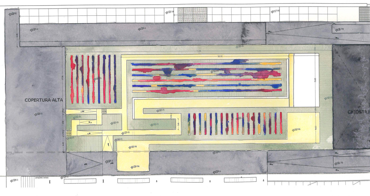 Il percorso espositivo vuole sintetizzare le tre fasi essenziali della creazione artistica: l'ideazione, la progettazione e la realizzazione. L'ideazione viene manifestata attraverso una serie di bozzetti, acquerelli e appunti. La progettazione, con il suo sviluppo tecnico, è rappresentata da disegni tecnici e plastici. La fase di realizzazione e il suo processo creativo sono visibili attraverso video e fotografie che offrono una lettura approfondita delle opere e nella sorprendente installazione luminosa intitolata "All'imbrunire". Quest'ultima, posizionata nella parte più alta del palazzo, sul terrazzo, interagisce direttamente con la città attraverso la luce, creando un magnifico equilibrio tra gli spazi pubblici e privati.