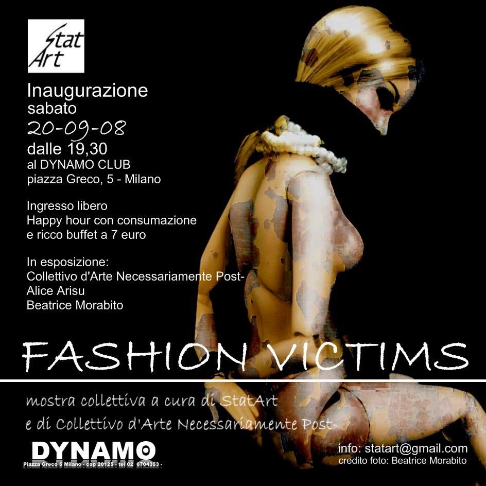 Fashion Victims è una mostra collettiva che inaugura al Dynamo in concomitanza con la settimana milanese della Moda femminile. Protagonisti dell’evento sono otto artisti emergenti, che attraverso opere di stili e tecniche differenti esprimono le loro riflessioni sul tema della corporeità. Curata da StatArt, in collaborazione con Collettivo d’Arte Necessariamente Post-, la mostra propone una galleria di vigorose immagini in grado di stimolare la riflessione sul valore estetico del corpo.