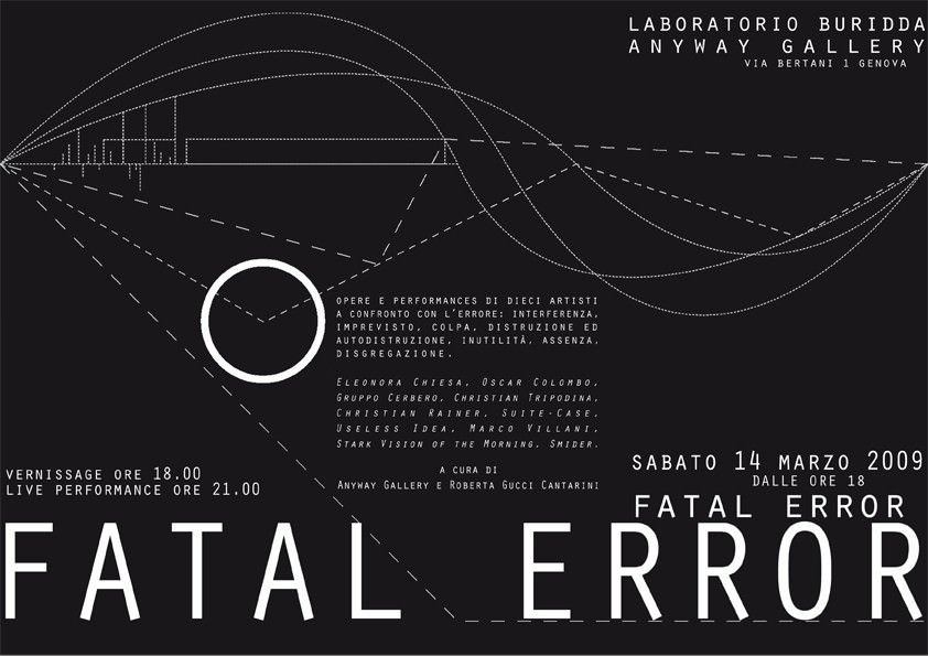 Sabato 14 marzo 2009 alle ore 18.00, presso il Laboratorio Sociale Buridda, Via Bertani 1, Genova, Anyway Gallery e Roberta Gucci Cantarini presentano FATAL ERROR, mostra collettiva che unisce opere e performances di dieci artisti visuali e musicisti a confronto con l’errore: interferenza, imprevisto, colpa, distruzione ed autodistruzione, inutilità, assenza, disgregazione.
